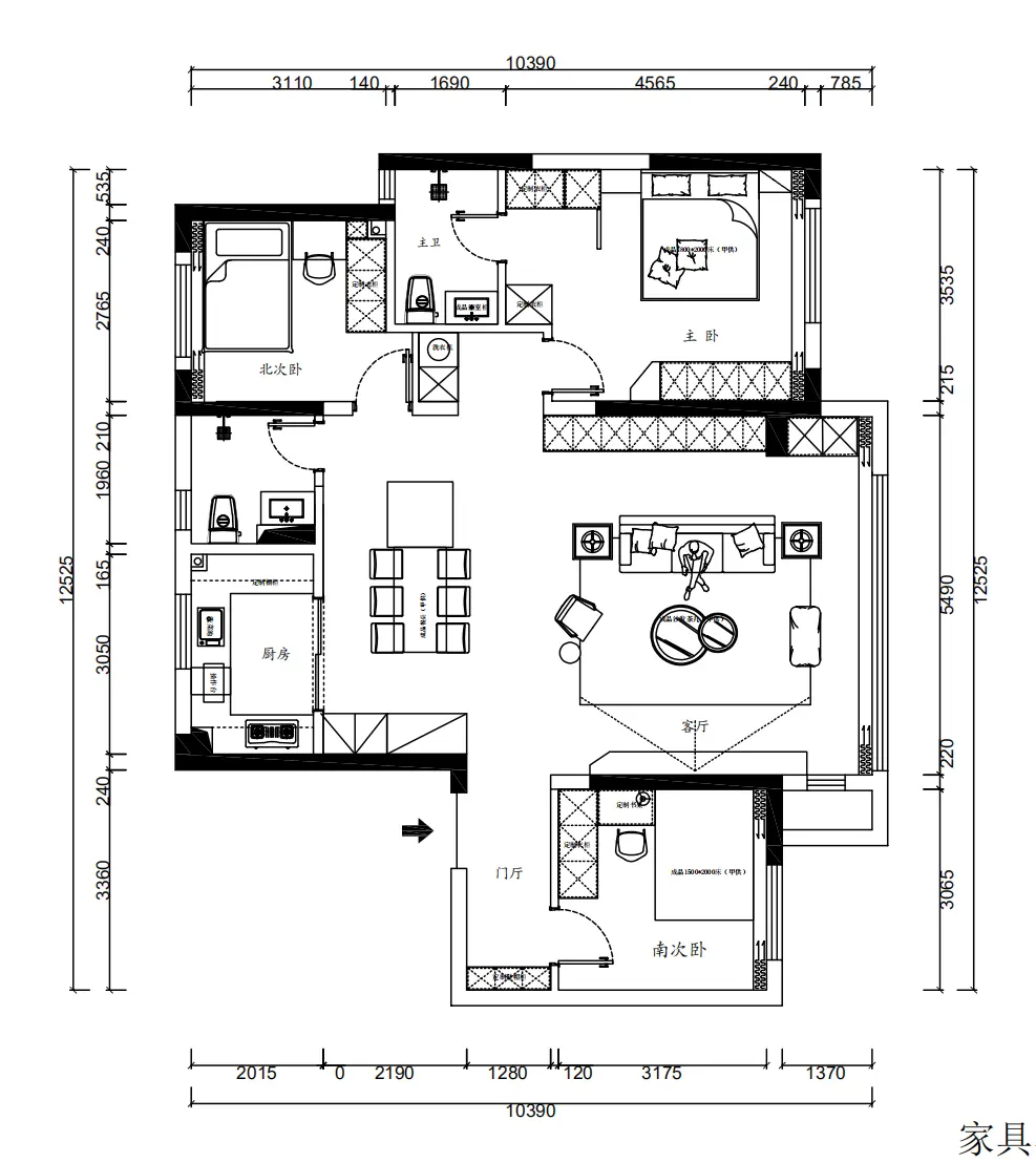 材质运用:首先家具材质主要运用布艺,框架木制质感温润,搭配恰到好处的石材,碰撞出最纯粹的情感。如果生活需要调味剂,那柔软的布艺和清爽的皮革一定是首选,加上玻璃和金属的融合,讲述家的情感故事。