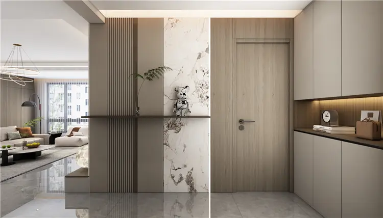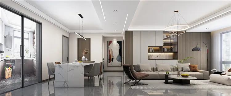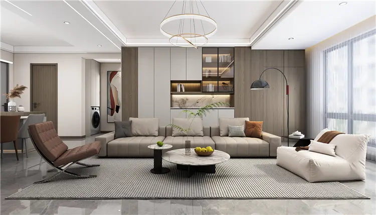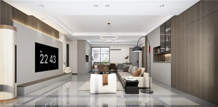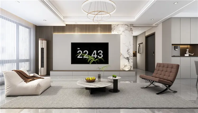 客厅空间主要是以大面积的暖色系铺陈开来,大理石与木饰面的拼接,暖咖色点缀其间,串联起家中的每一个房间,赋予空间温馨的居住氛围。