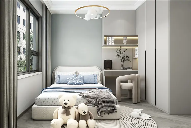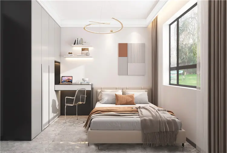卧室设计采用温柔的大地色系,选用不同的材质和光影来建立空间的丰富层次,营造了温馨氛围,简单纯粹的留白,让生活返璞归真。