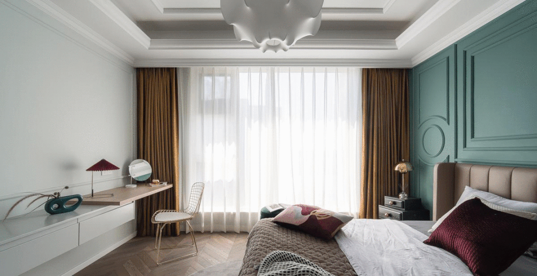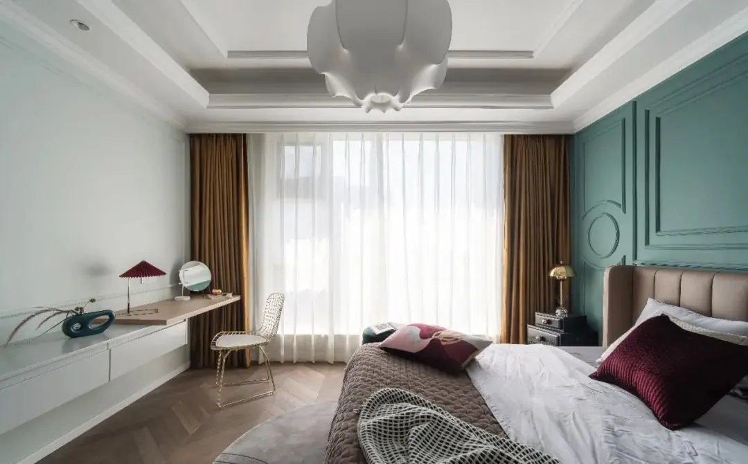 卧室增加了屋主需要的梳妆、学习等实用功能,背景墙部分去除原有的老气装饰,沿用屋主喜欢的深绿色系。