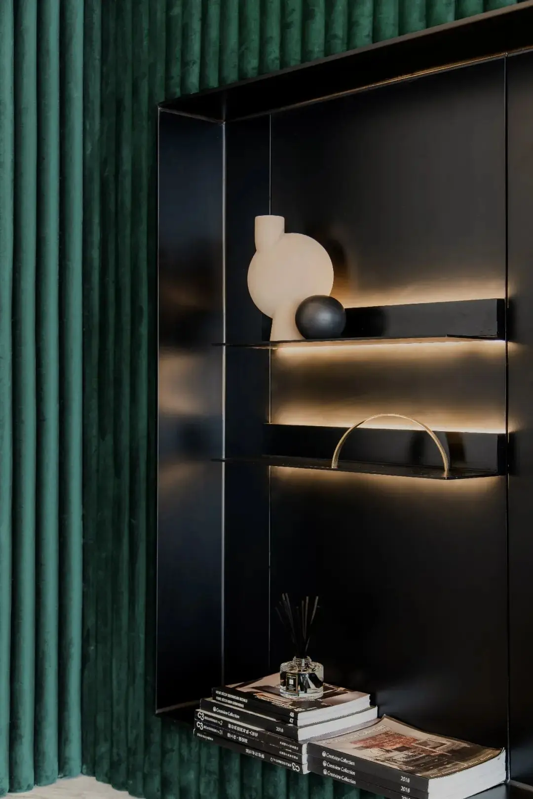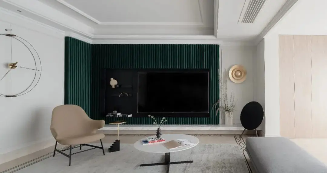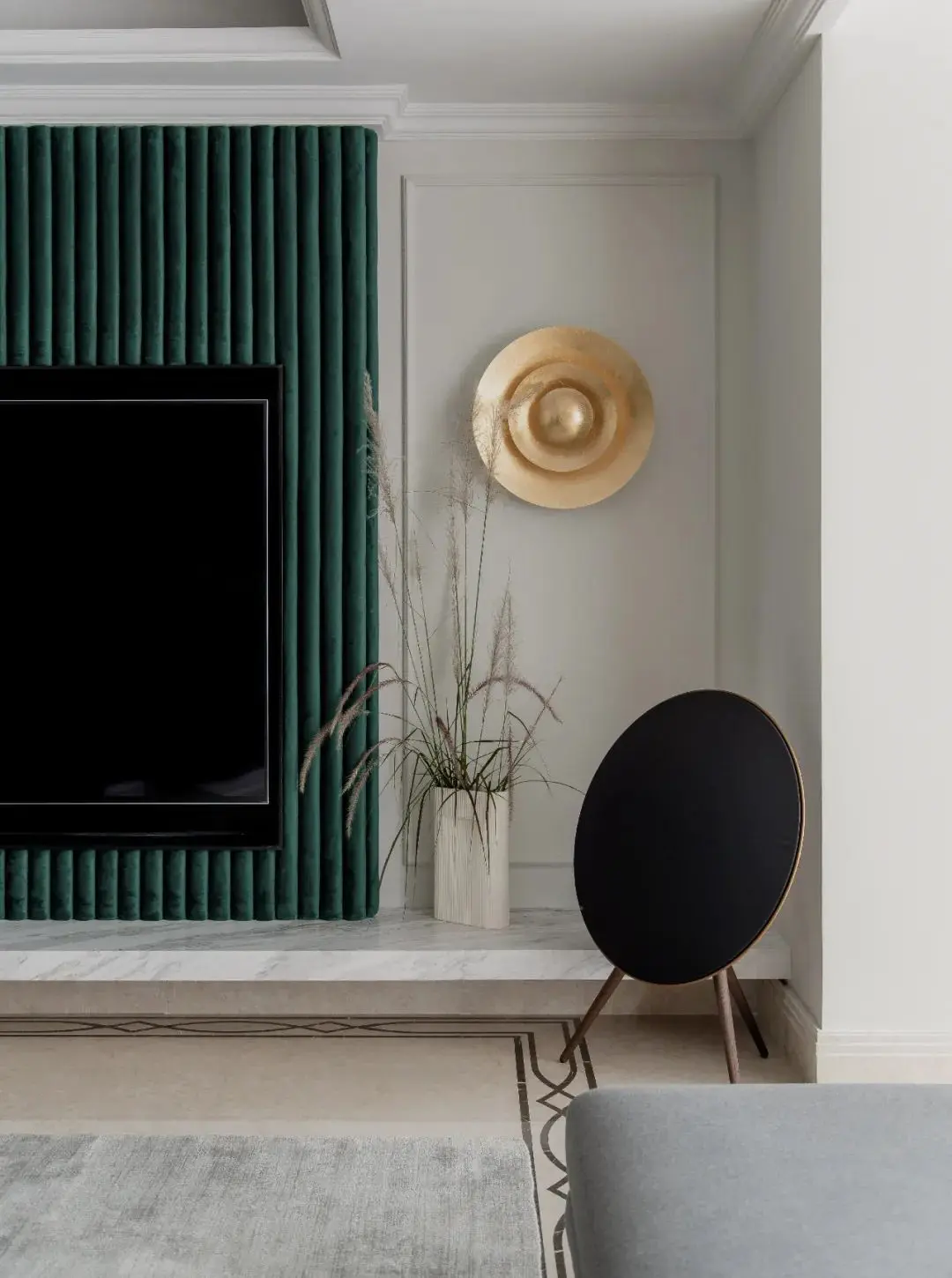 客厅电视背景墙根据屋主喜好设计了一面丝绒材质L型延伸的电视墙,打破原本对称、拘谨的空间格局,让空间更柔软放松。