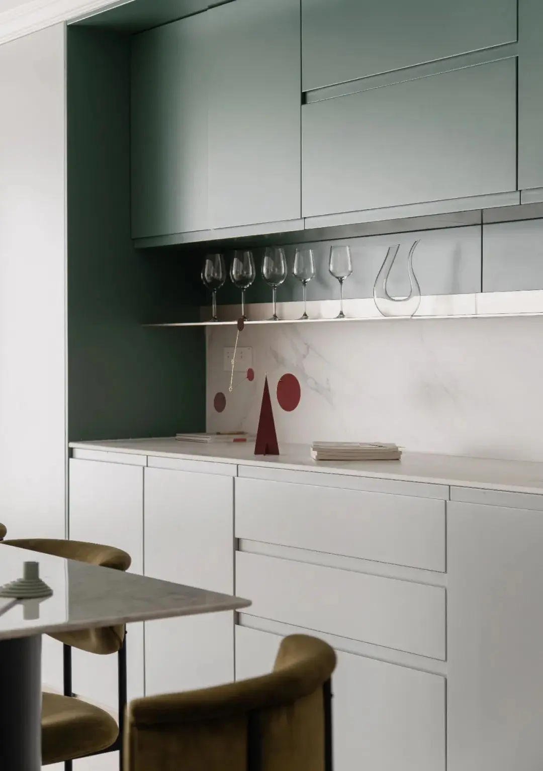 餐厅在沙发后位置,依靠增设了一排西厨柜,侧面嵌入对开门冰箱,平时拿取方便。