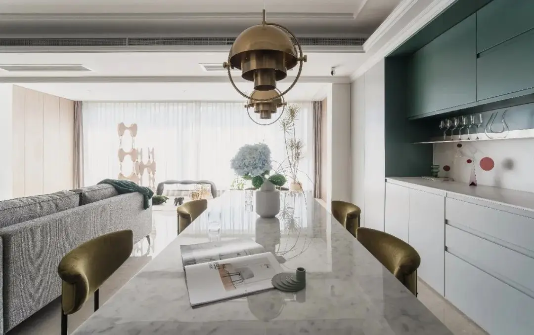 餐桌选择的是2.2米长度,可同时满足8~10人用餐,还能增加西厨操作台,非用餐时间也可以用来临时办公或者喝茶聊天。