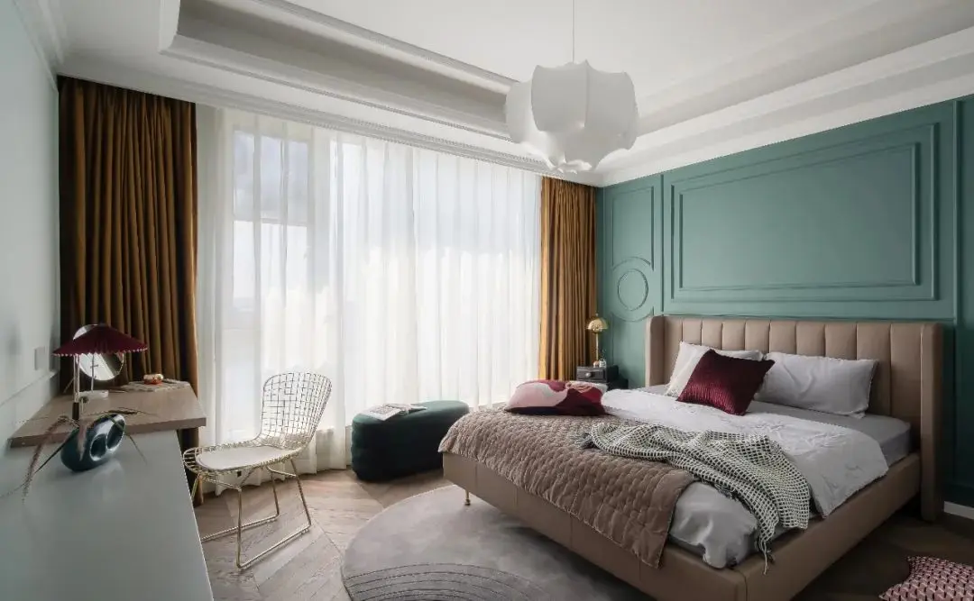 床尾靠近窗边的位置安排了独立梳妆台,早起光线更自然柔和,整体空间氛围更休闲惬意。