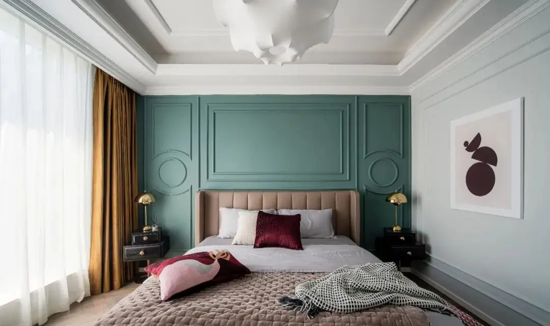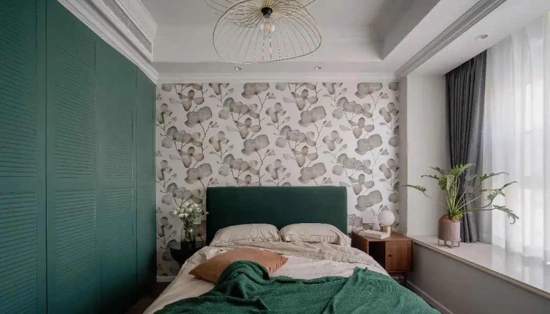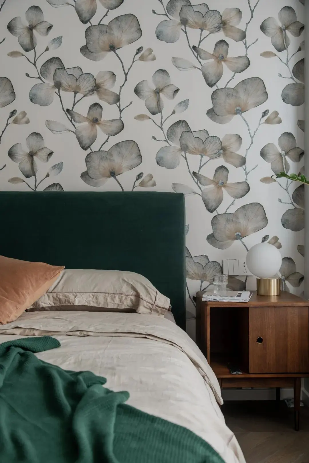 次卧是给老人居住的,设计相对简单,墨绿丝绒床档延续公区的复古元素,搭配胡桃木床头柜、杏色床品、黄铜色灯饰做点缀,既温馨又有仪式感。
