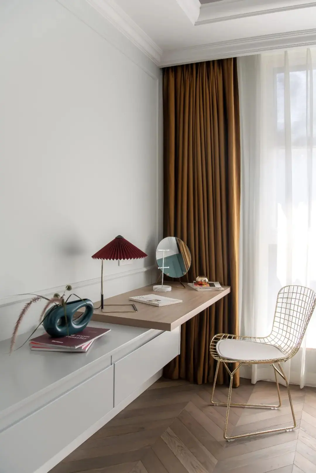 梳妆台和电视机柜做穿插组合,悬空的木质搁板造型简洁,和整体复古氛围形成对比,轻盈有呼吸感。