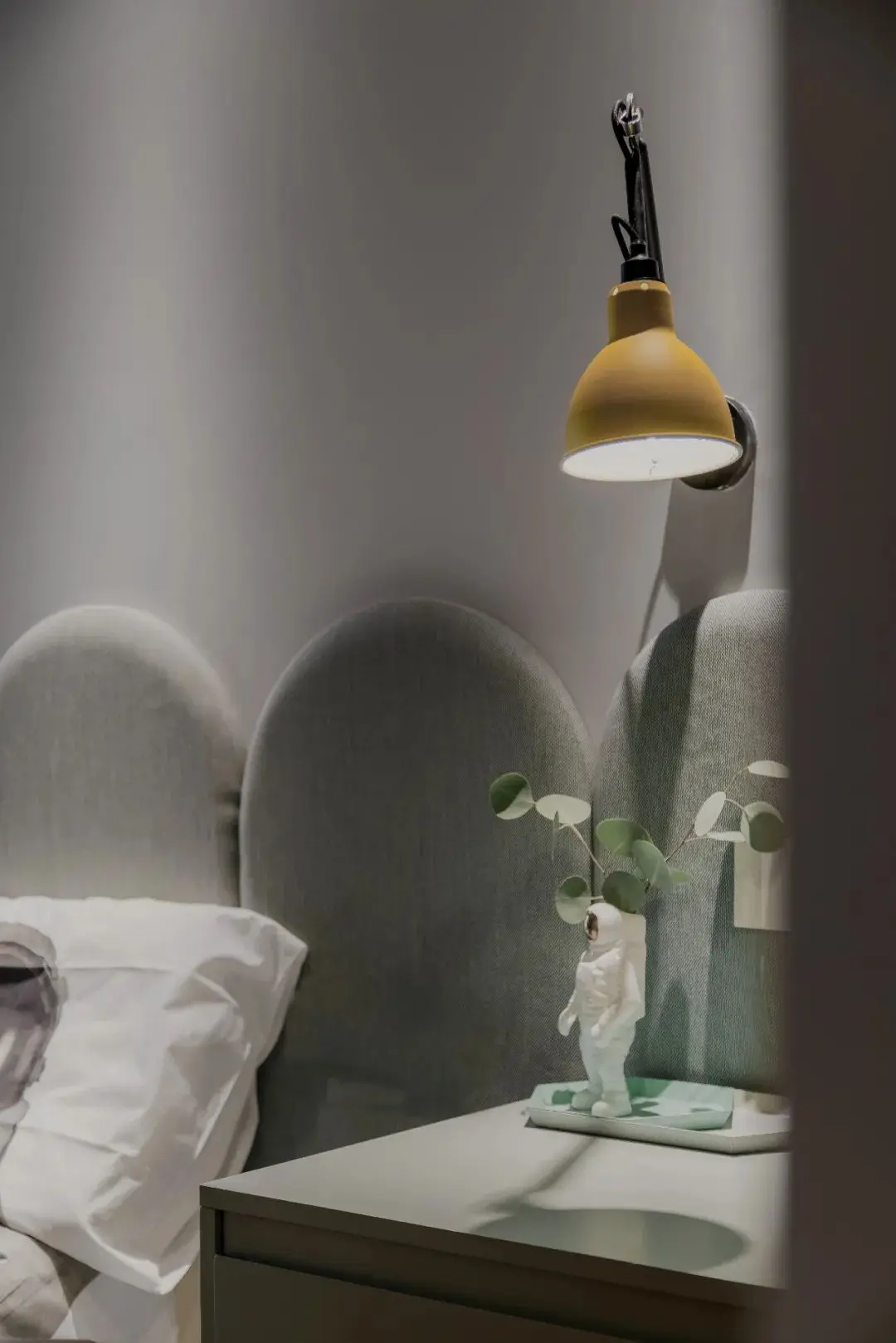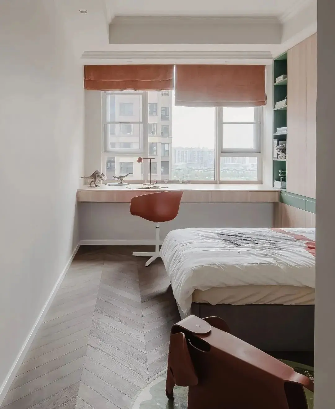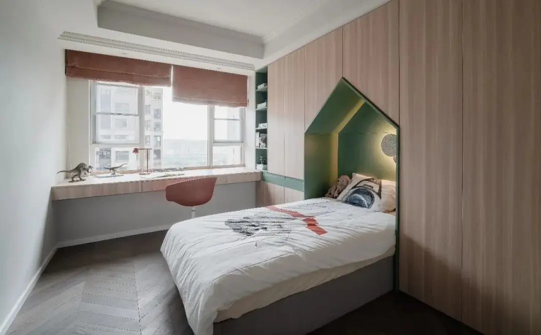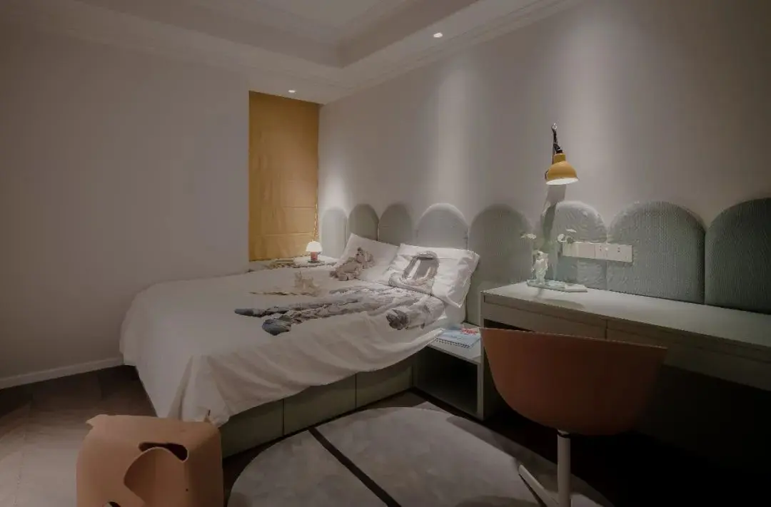 另一间儿童房面积不大,床和书桌做通体设计,利用床头的软包靠背把这两个功能串联在一起。