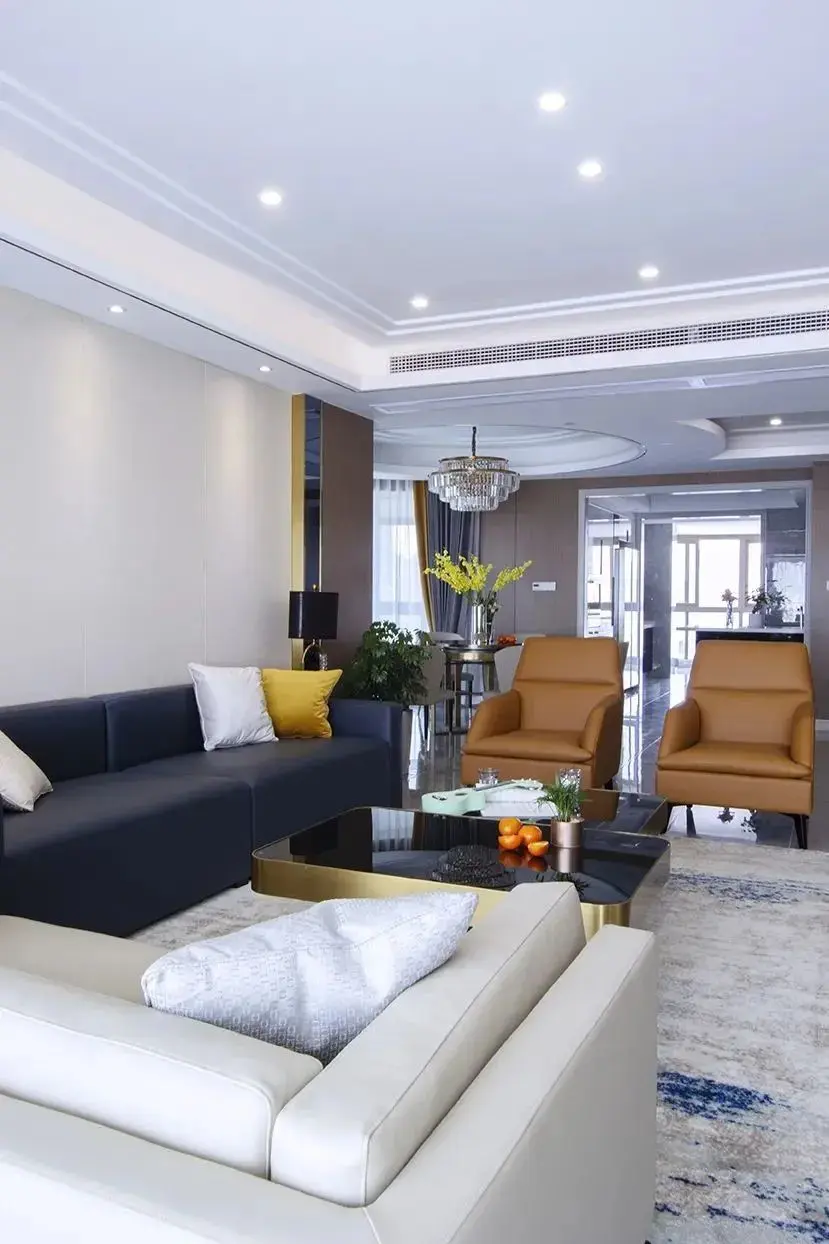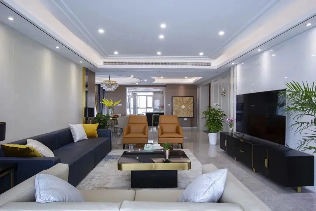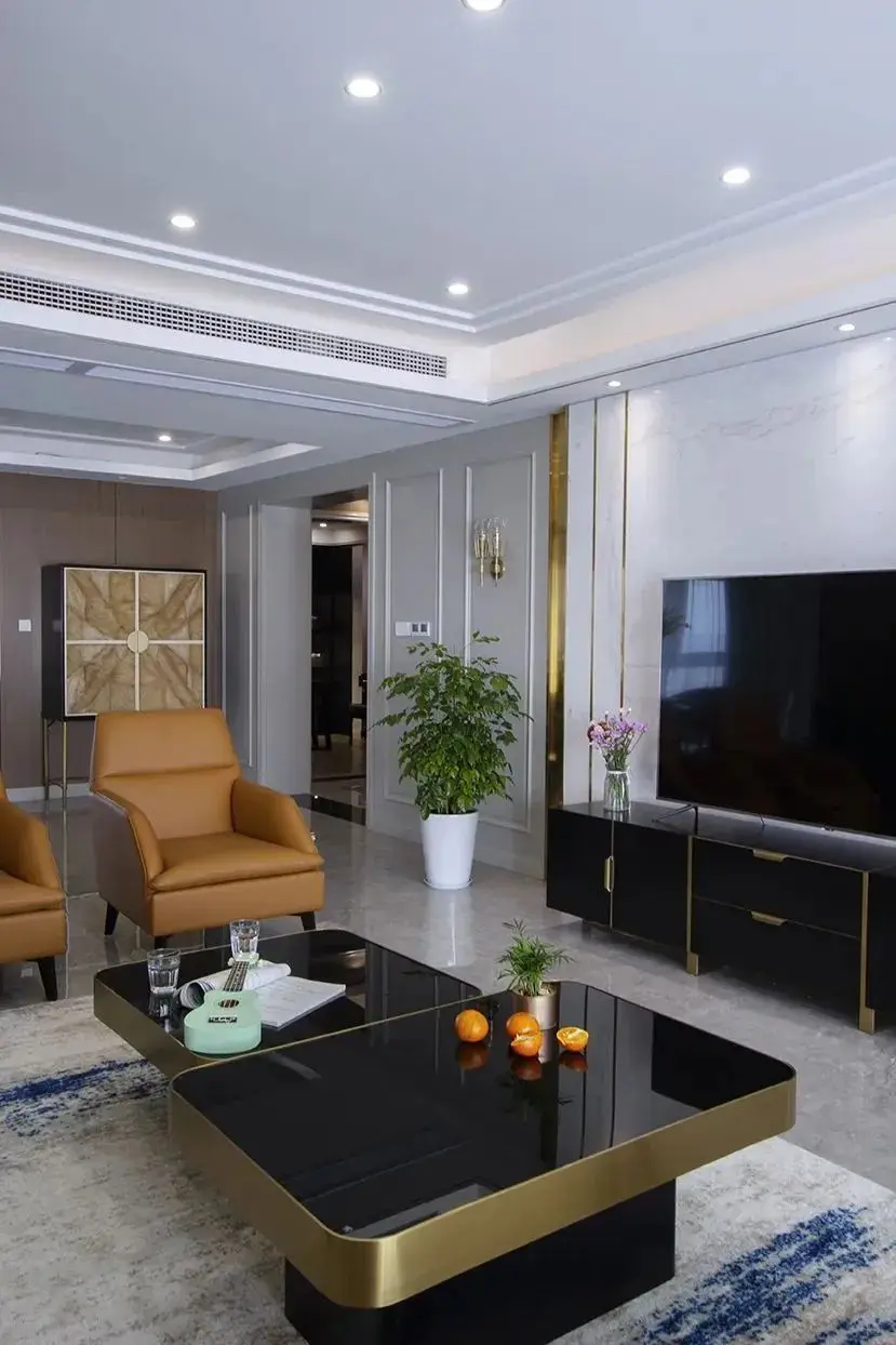 客厅采用无主灯设计,空间宽敞明亮。轻奢复古的家具和整体的设计风格完美搭配。
