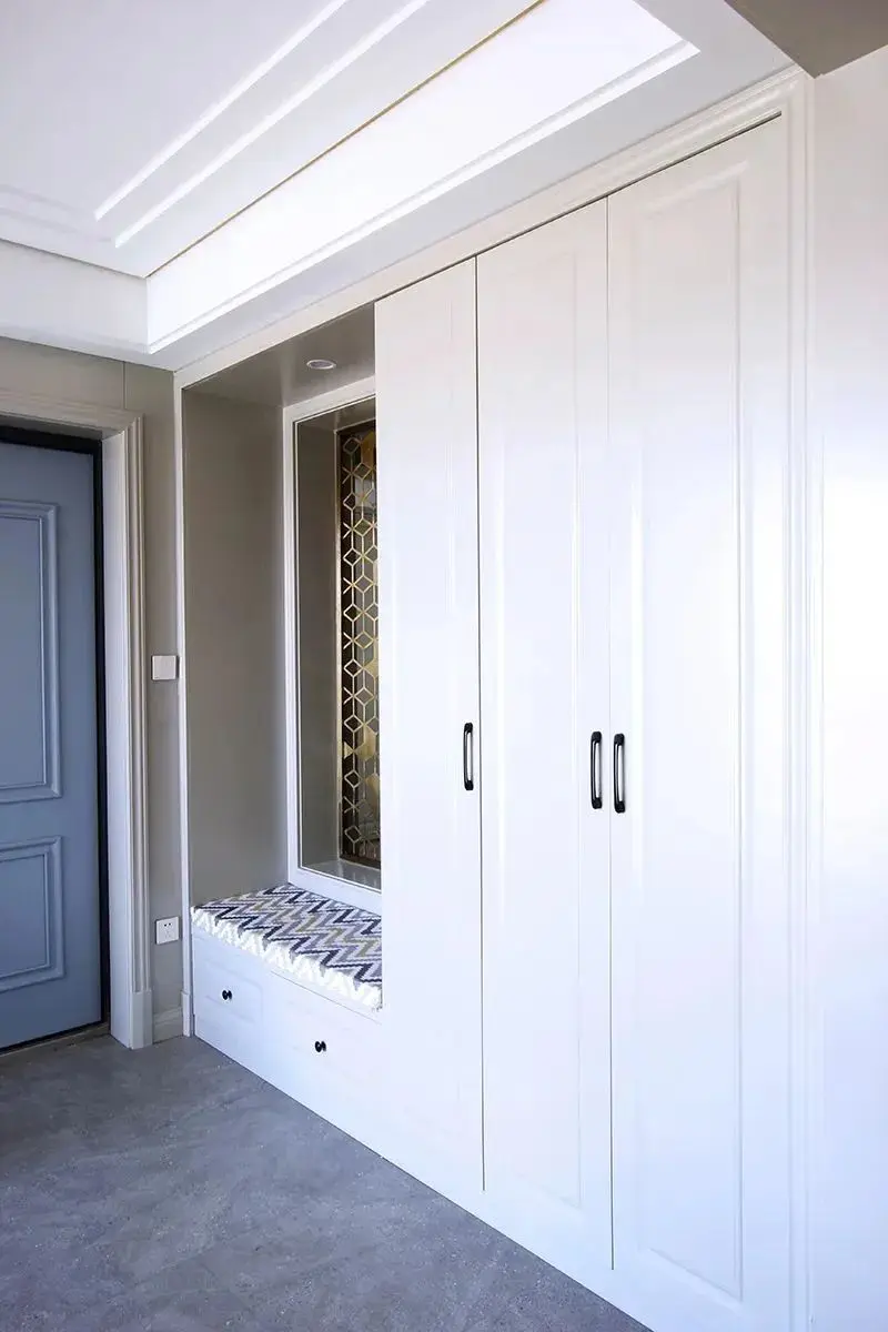 玄关定制到顶的白色鞋柜,还嵌入换鞋凳,设计非常贴心。