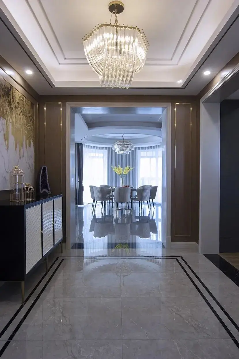 玄关换鞋区后还有一个缓冲的空间,布置端景柜,摆上装饰品与挂画,空间瞬间就变得华丽又精致。