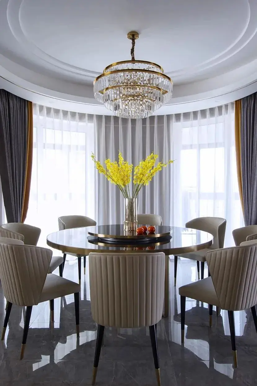 过了玄关进入餐厅区域,半圆形的窗户与圆形吊顶遥相呼应,大圆桌的设计让用餐氛围更加温馨。