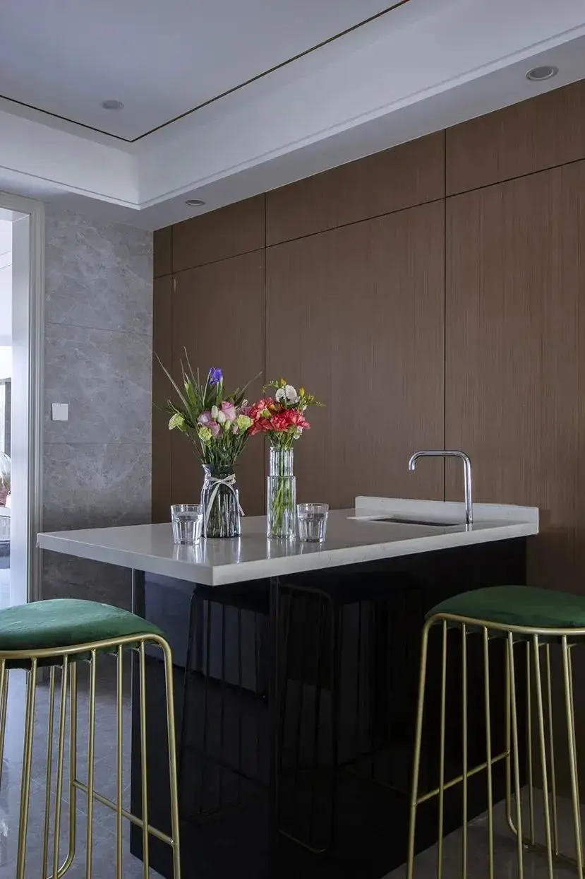 餐厅后面还设计了一个小吧台,大理石的台面搭配金属范的吧椅,典型的轻奢风格设计。