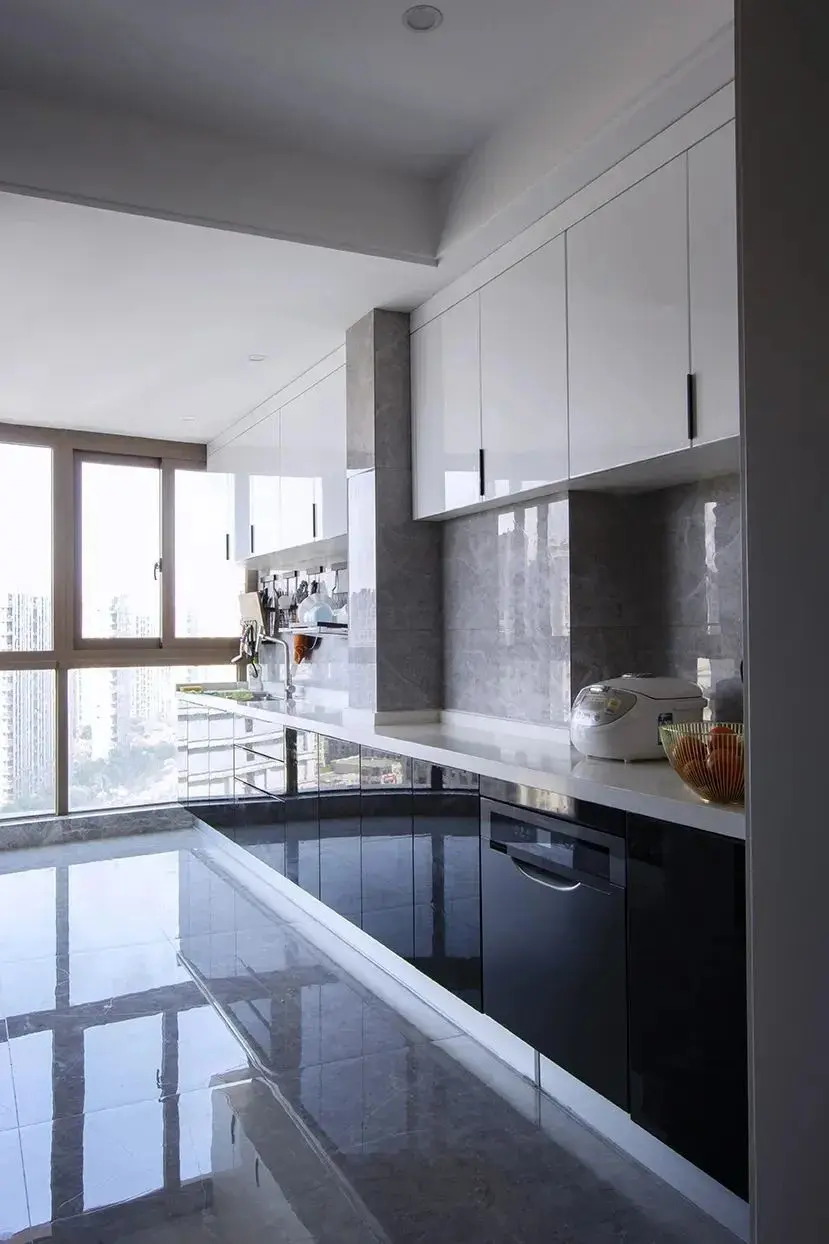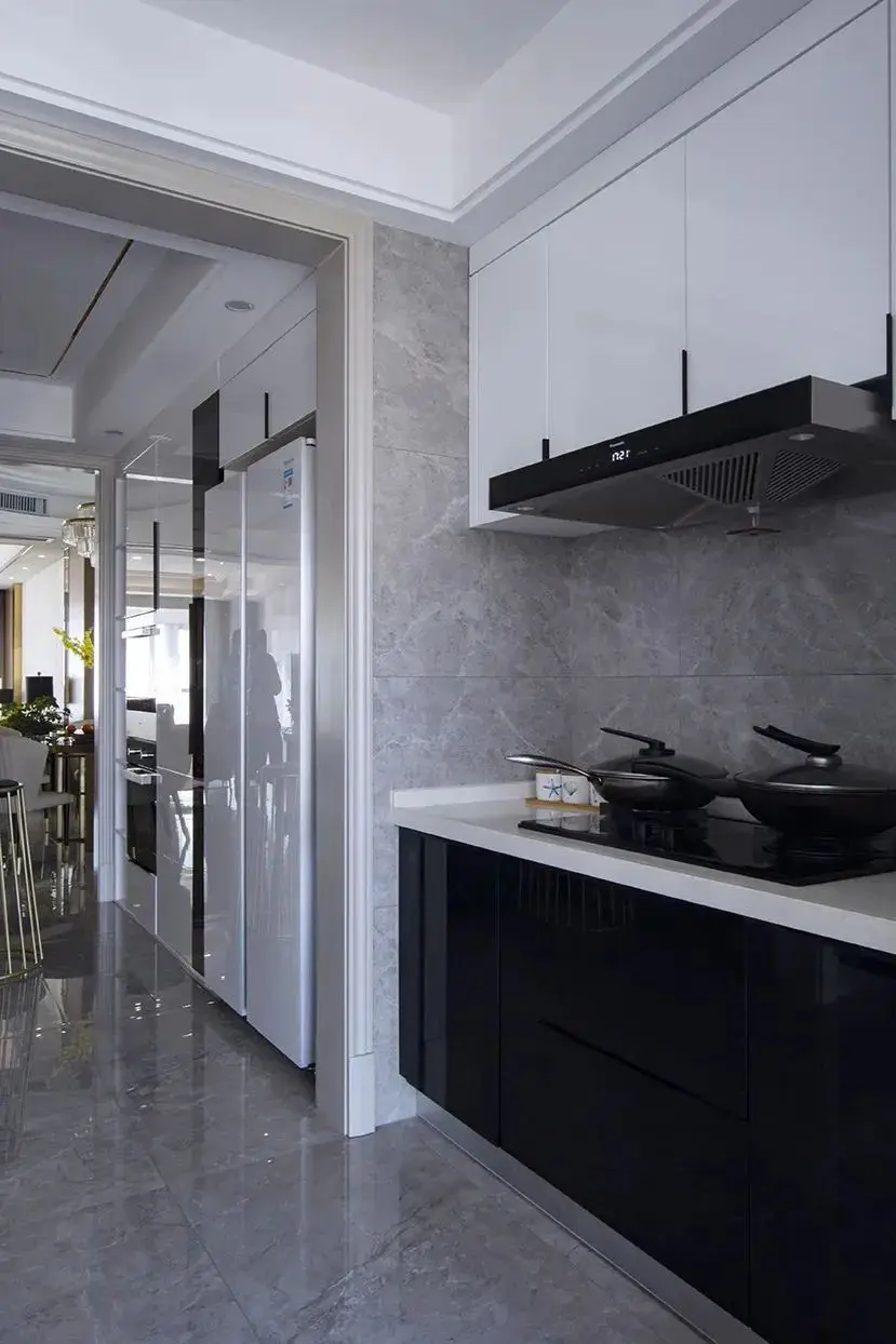 厨房的设计很有现代感,灰色墙面地砖搭配黑色橱柜、白色操作台,既酷炫又实用。