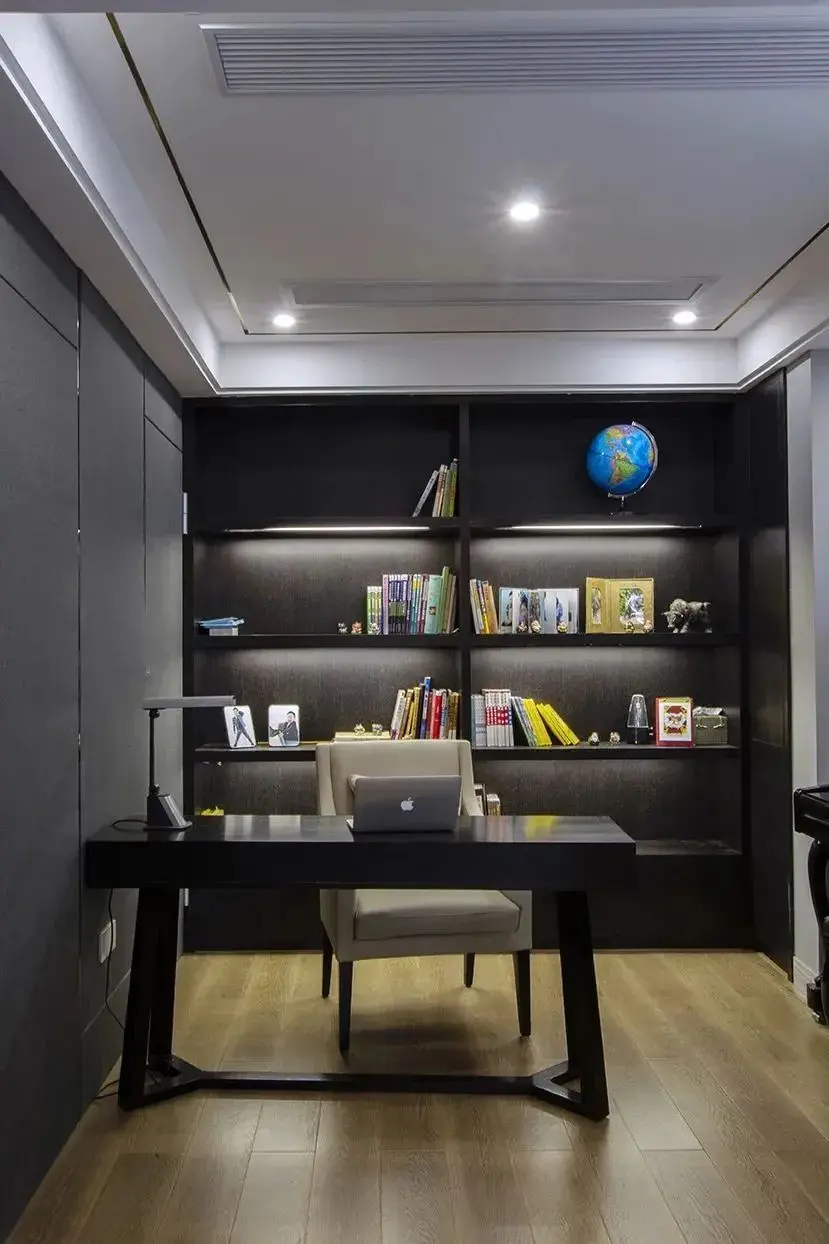 书房整体是深色调的,深色的书架搭配深色办公桌,为主人提供了一个安静轻松的学习办公环境。