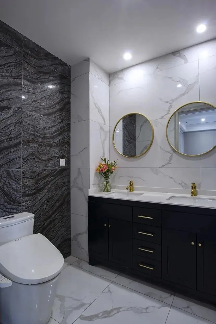马桶后方加入深灰墙砖,搭配黑色双人位的洗手盆柜。墙面挂上圆形金属框的镜子,让卫浴空间显得格外精致。
