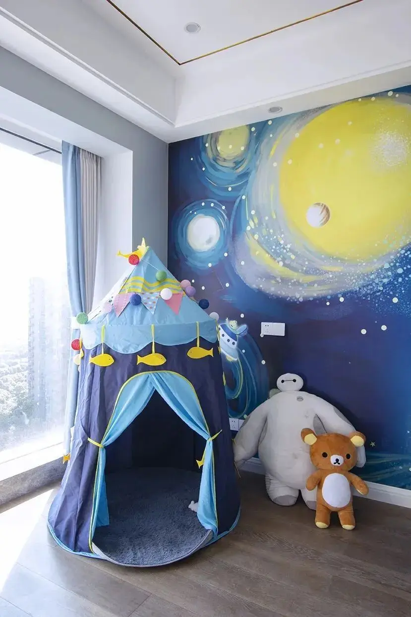 儿童房有一大一小两间,小儿童房暂时没放床铺,墙面设计太空主题的墙绘,布置可爱的小帐篷,为孩子玩耍游戏提供空间。