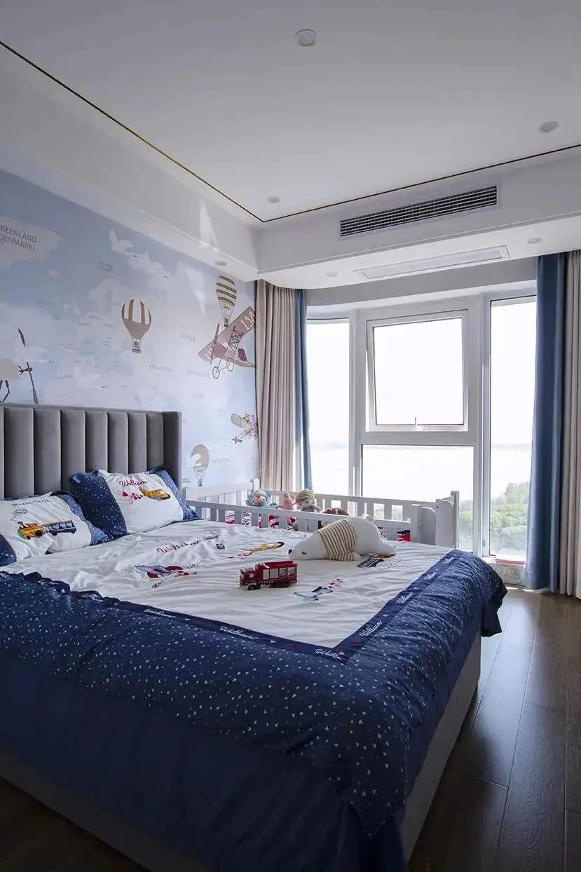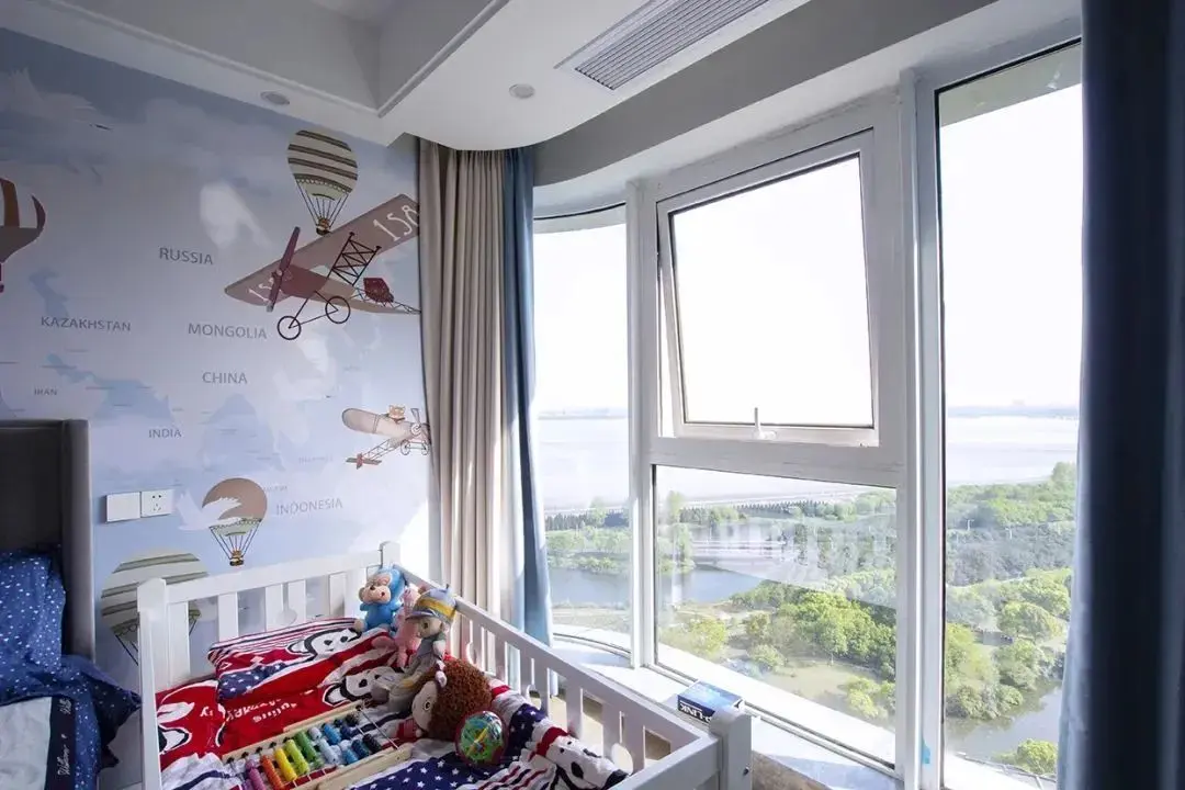 蓝色系的空间,卡通主题的画面,结合窗外自然舒适的江景,童趣舒适的空间显得安静自然。