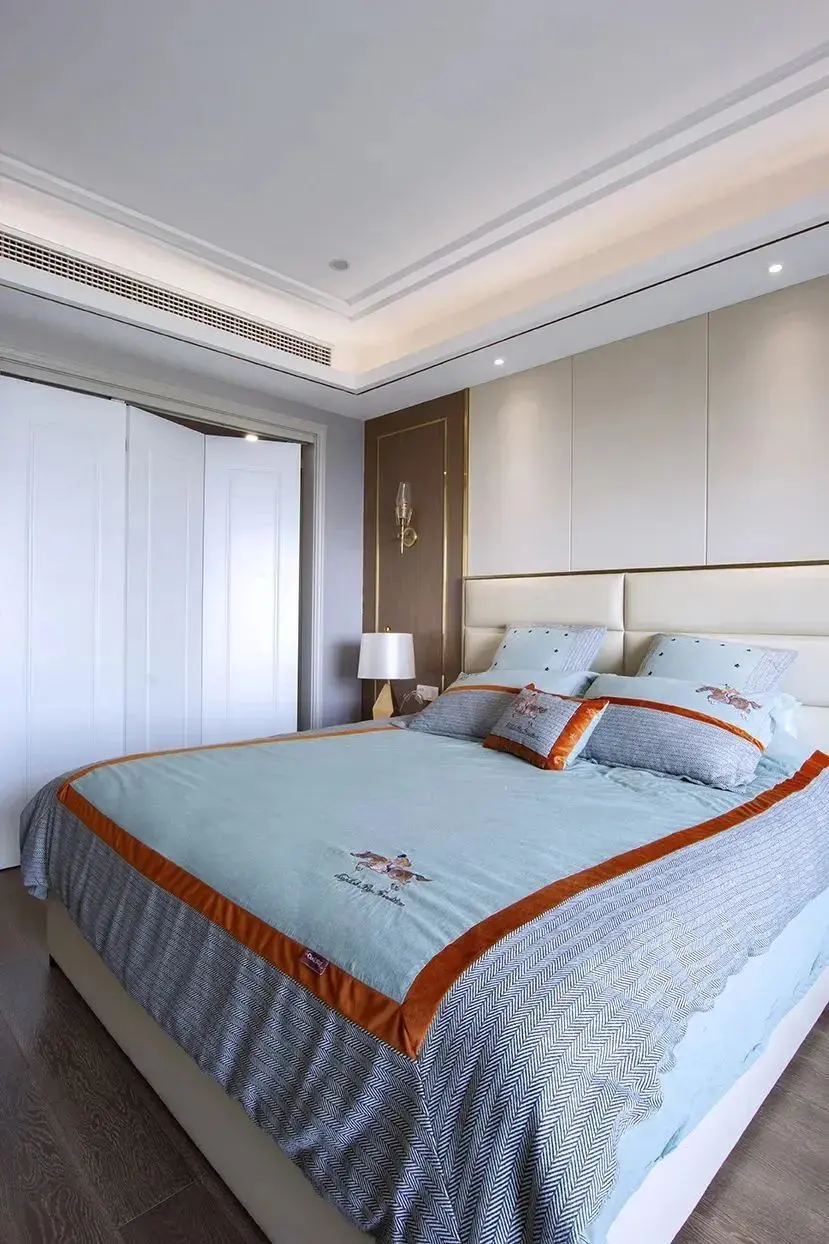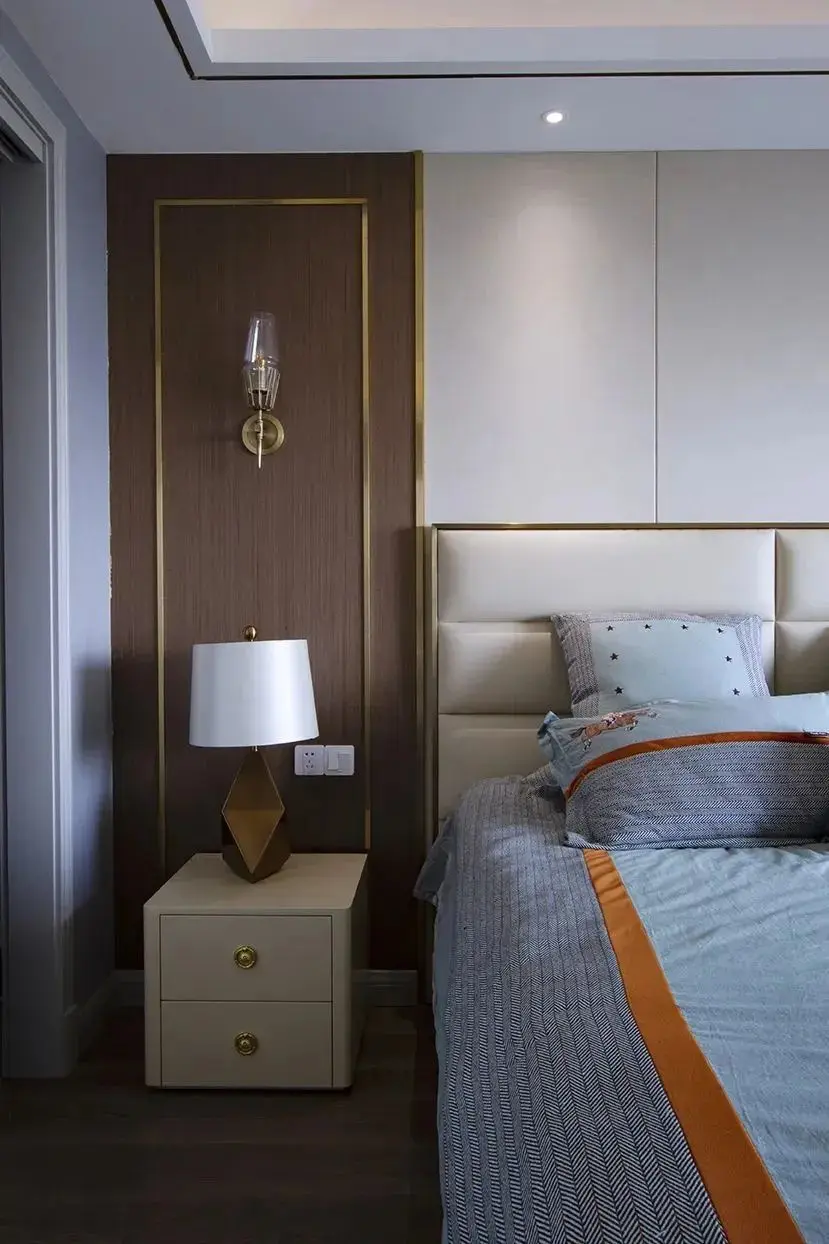 卧室床头墙以软包+木饰面为背景,象牙白的床头柜上摆设轻奢优雅的床头灯,营造良好的睡眠氛围。