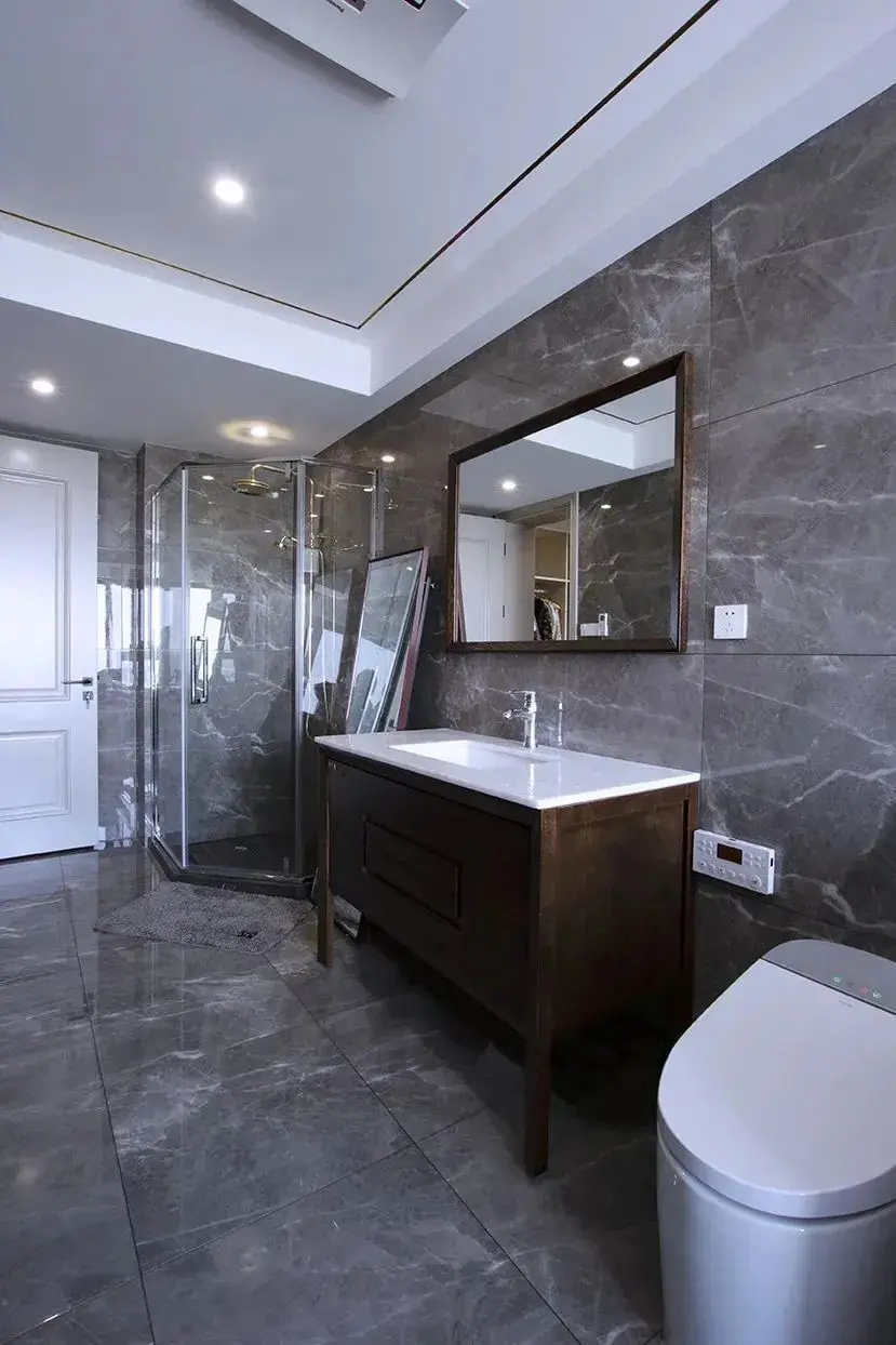 主卫采用灰色地面与墙面砖,搭配钻石型的淋浴房,宽松的空间带来舒适轻松的卫浴体验。