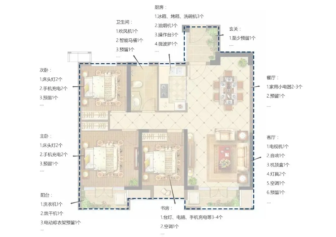 依此类推,屋主可以根据使用场景和生活习惯,在户型图上分别统计出玄关、客厅、餐厅、厨房、卧室、书房、卫生间、阳台、卫生间等各个功能区需要的插座数量。