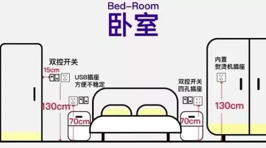 低层:在床头触手可及处,离地70cm可布置卧室主灯的双控开关,便于躺在床上控制卧室照明;同一高度,床两边可各布置1-3个四孔、五孔插座(含USB),满足手机、加湿器、小台灯的使用;衣柜内部,离地130cm处可预留一个五孔插座给熨烫机使用。