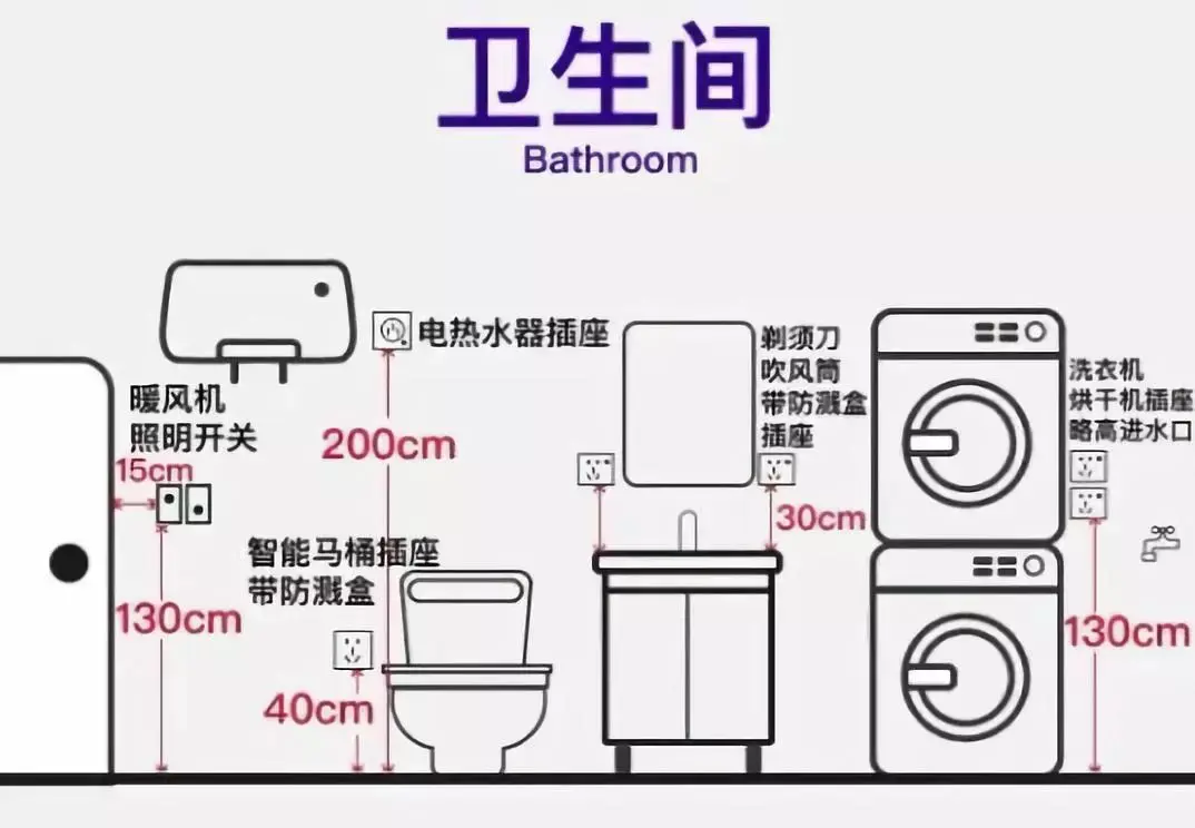 电器、家具高低各不同,所以插座的高度要考虑到位,不被遮挡、使用舒适才算有效插座。这里以卧室和卫生间为例来进行分层立体布置,避免遮挡:
