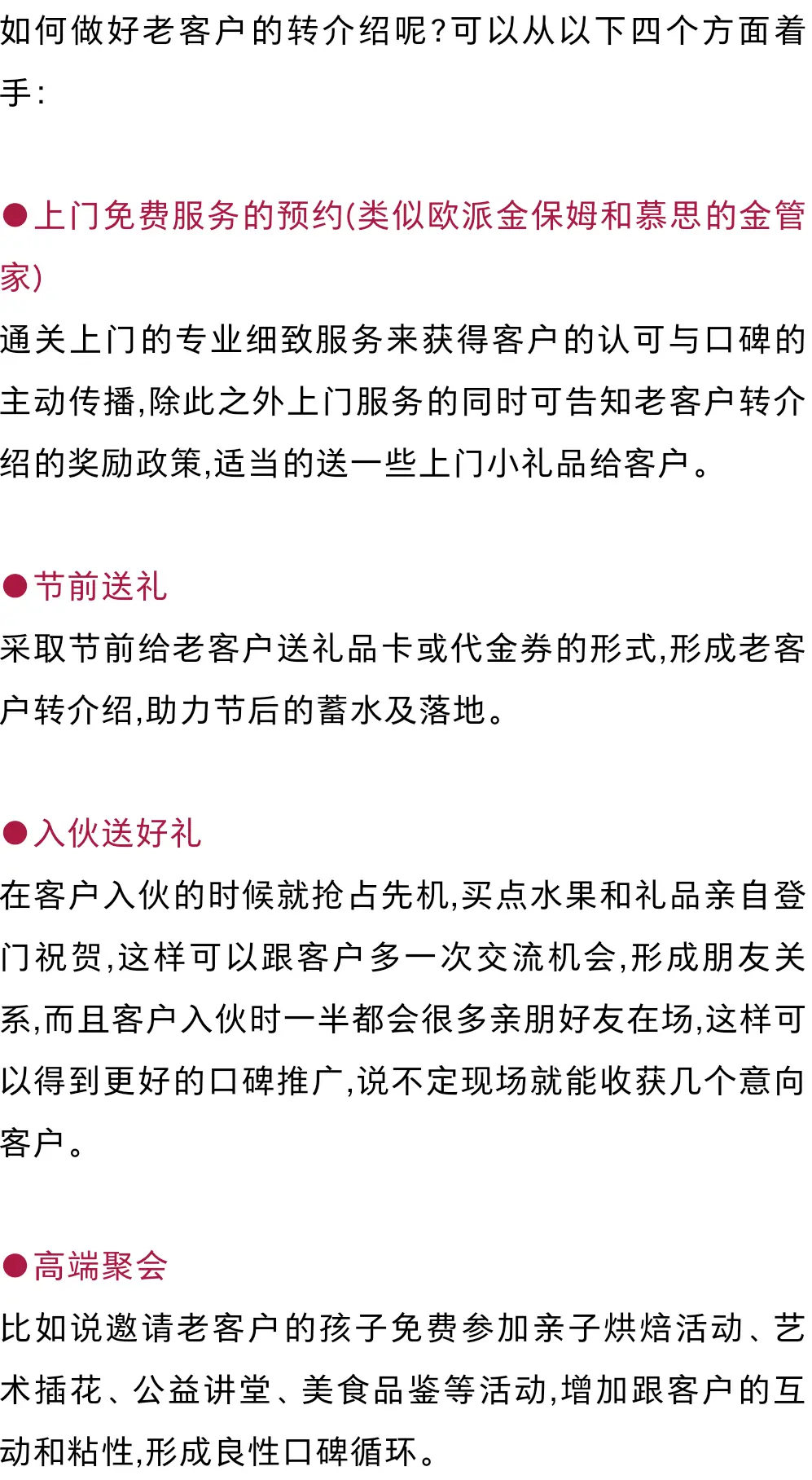 已成交的客户就是老客户,老客户资源是巨大的宝藏和财富,250定律告诉我们,每1个客户的背后都有250个潜在客户,所以维护好老客户是转介绍成功与否的关键。
