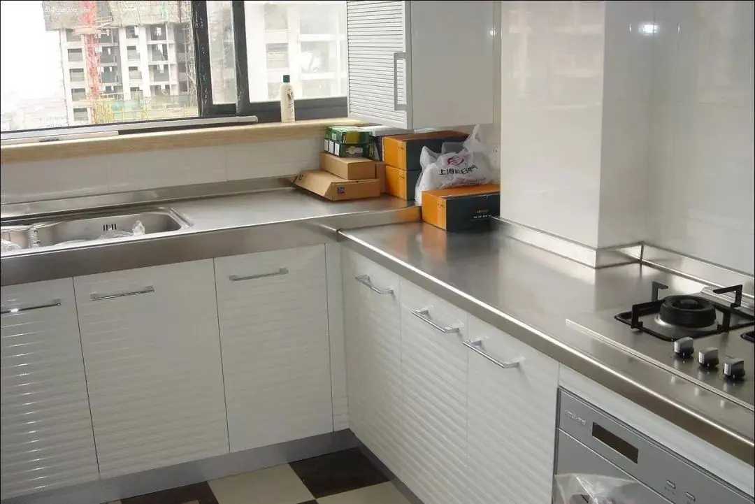 橱柜台面材料最常见的是石英石和复合亚克力人造石。不宜纯白色,易脏,建议用点石英石。台面靠墙建议要设计后挡水条,前挡水的话亚克力台面比较合适,石英石做前挡水一般缝隙明显不太好看。