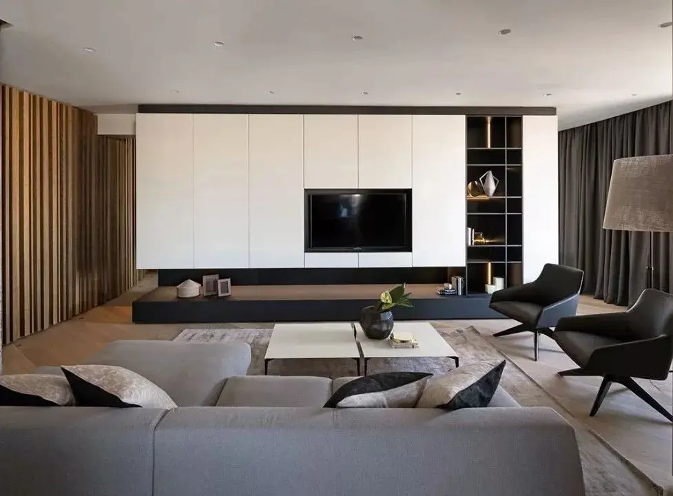 内嵌于墙面的电视柜最节省空间,根据墙面特点和电视的大小,现场定制收纳柜,容量大又整齐,可以满足大部分的公共物品收纳或图书、藏品的收纳。