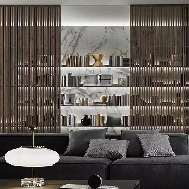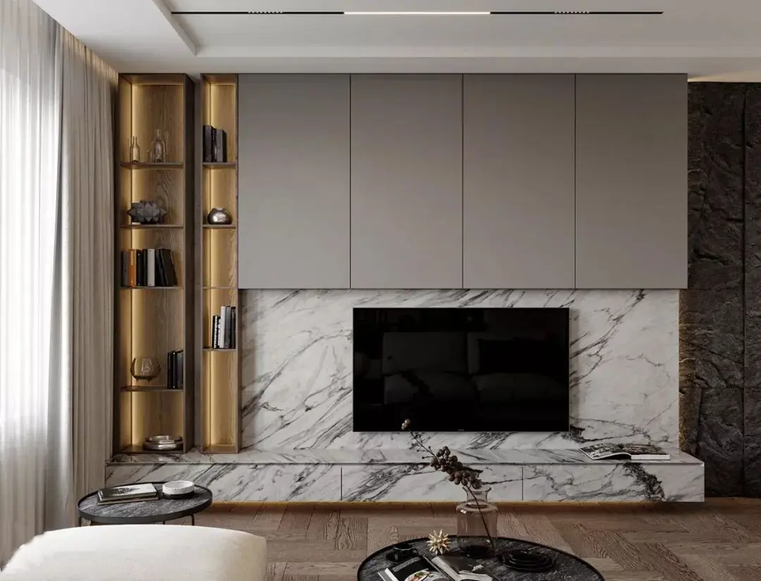 如果电视背景墙想要以展示和美观为主,可以在大理石、木材或石膏板等电视背景墙上嵌入壁龛,新颖的结合方式,可以为空间带来意想不到的装饰性。