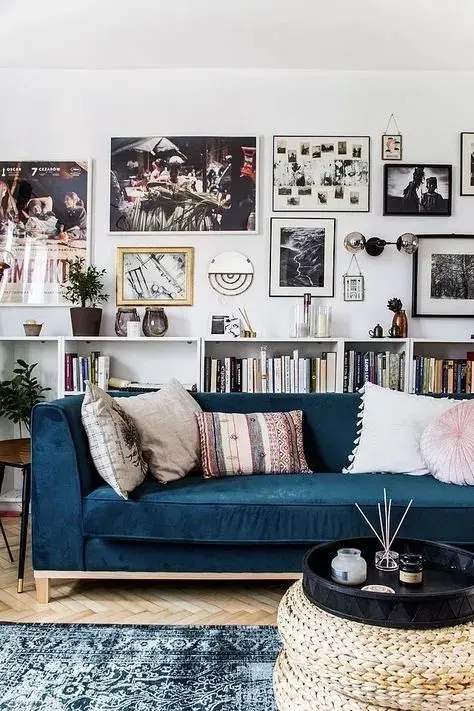 一些户型较小的居室,往往将书房的功能与客厅进行合并,因此客厅会有大量的书籍需要进行收纳。常见的收纳方式是在沙发边设计开放式书柜,既方便拿取,又不会占用过多的空间。