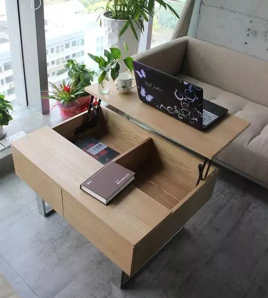 客厅除了墙面空间设计,还可以好好“挖掘”一下茶几的“潜力”。茶几是用来摆放茶水之物,表面还能做些简单收纳与装饰。带有抽屉的茶几,还能把零食和杂乱无章摆放的小饰品放在里面。另外现在有些多功能茶几,还可以兼具电脑桌的功能。