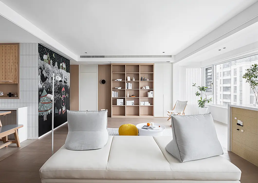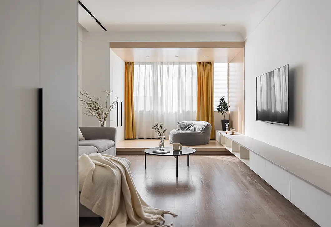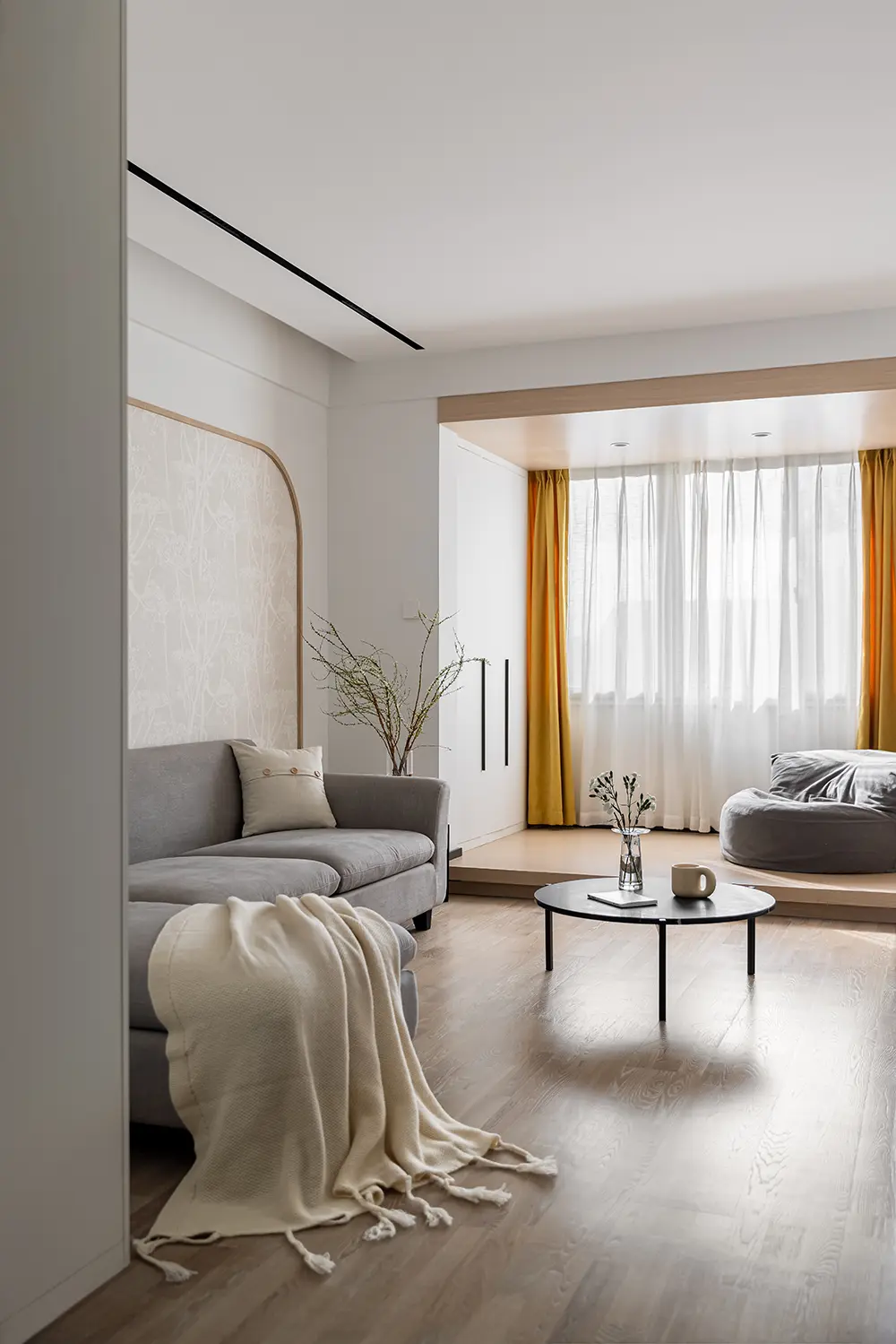 客厅的定制家具以白色调的基调为主,大面积留白,爱马仕橙色的窗帘,还有圆形的茶几,浅灰色布艺沙发,让空间显得简约轻松的视觉。