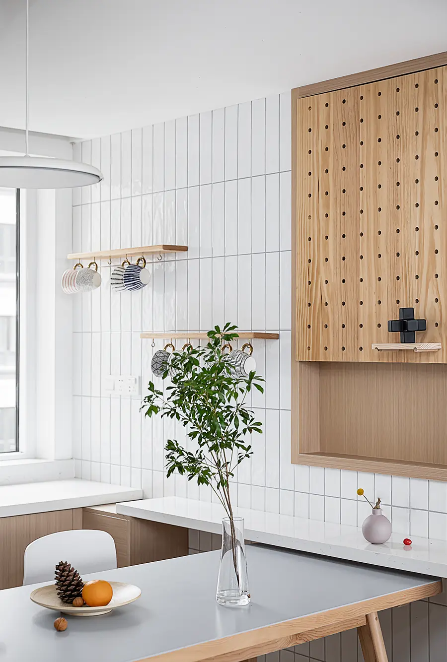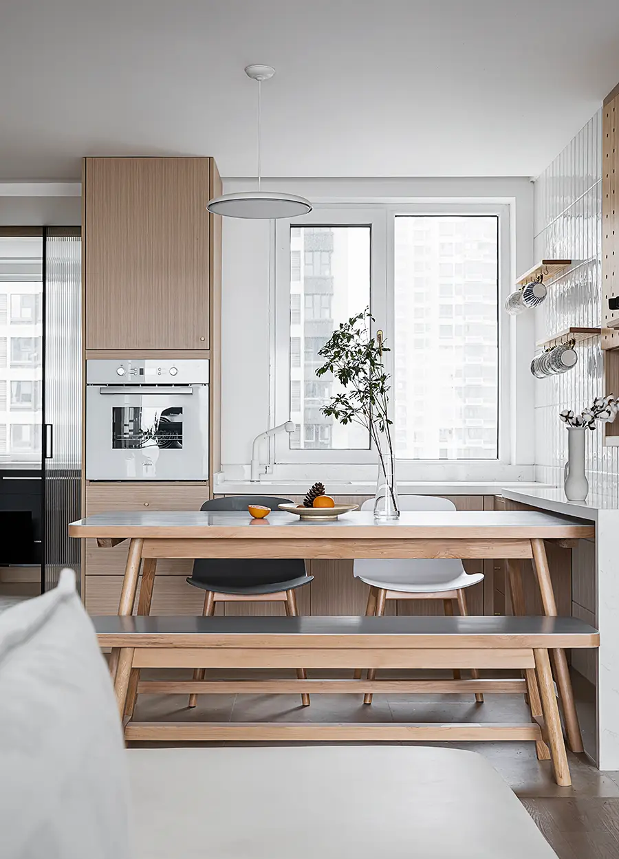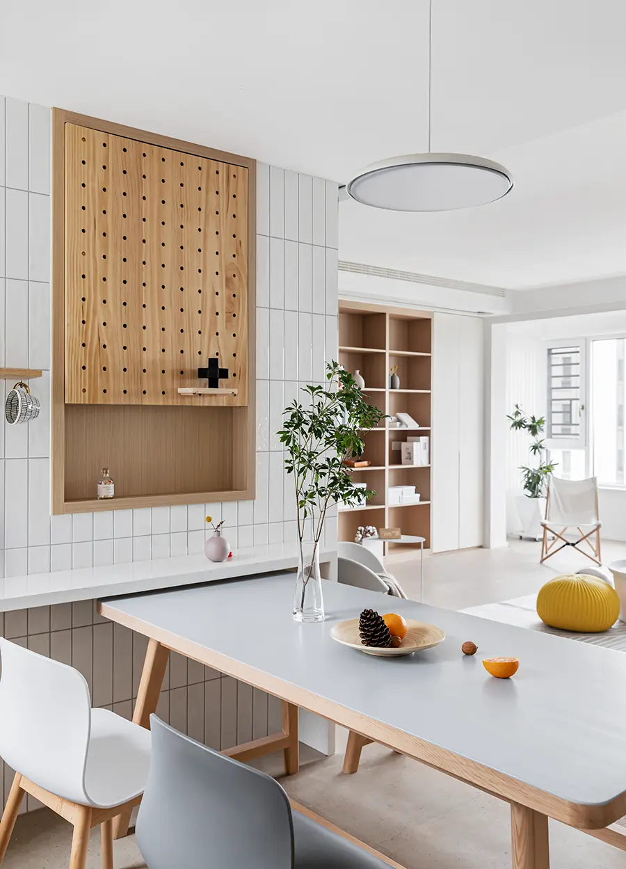 定制半开放餐边柜,作为厨房和餐厅的过渡与连接,白色与原木色搭配,整体呈现自然净透的空间质感。
