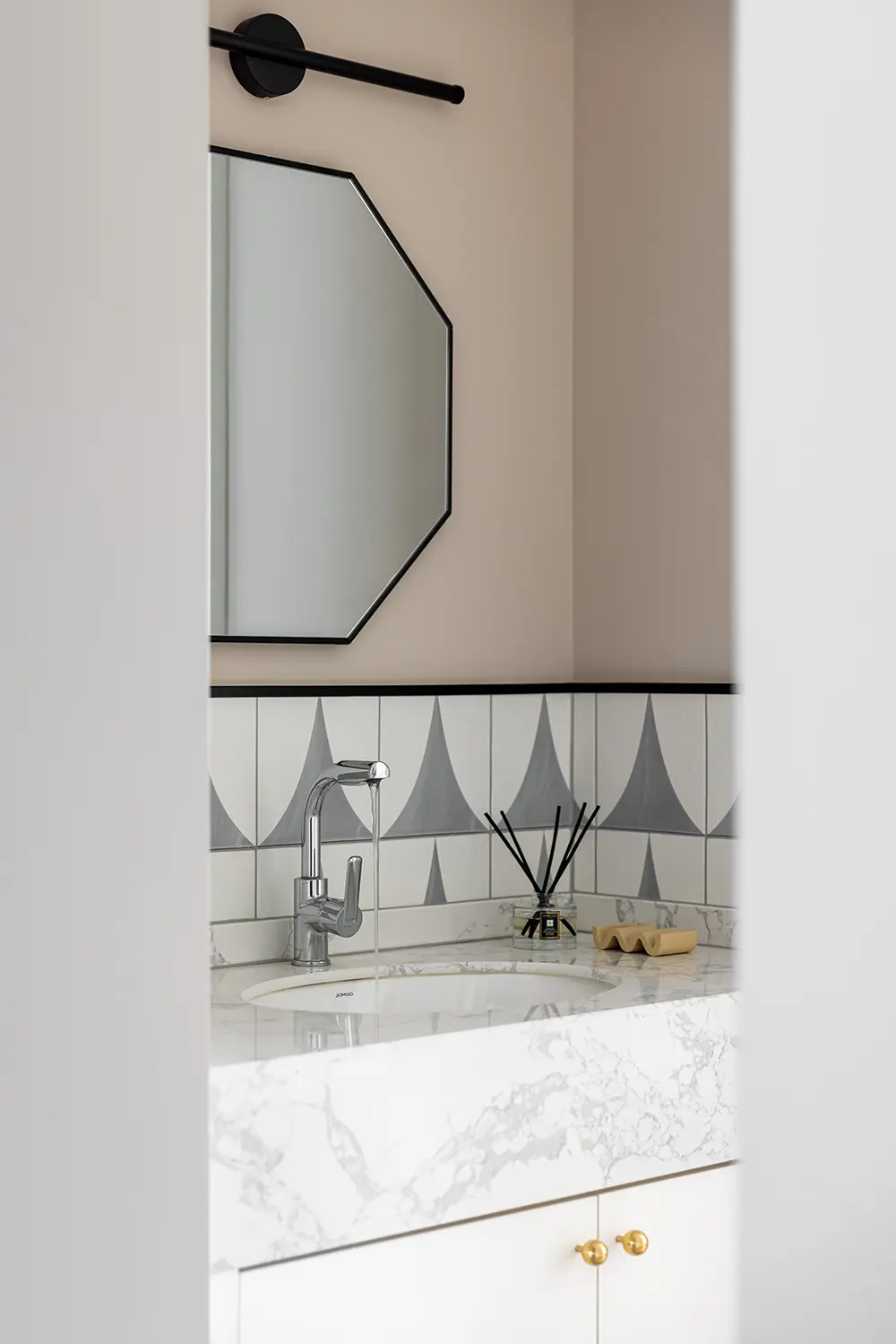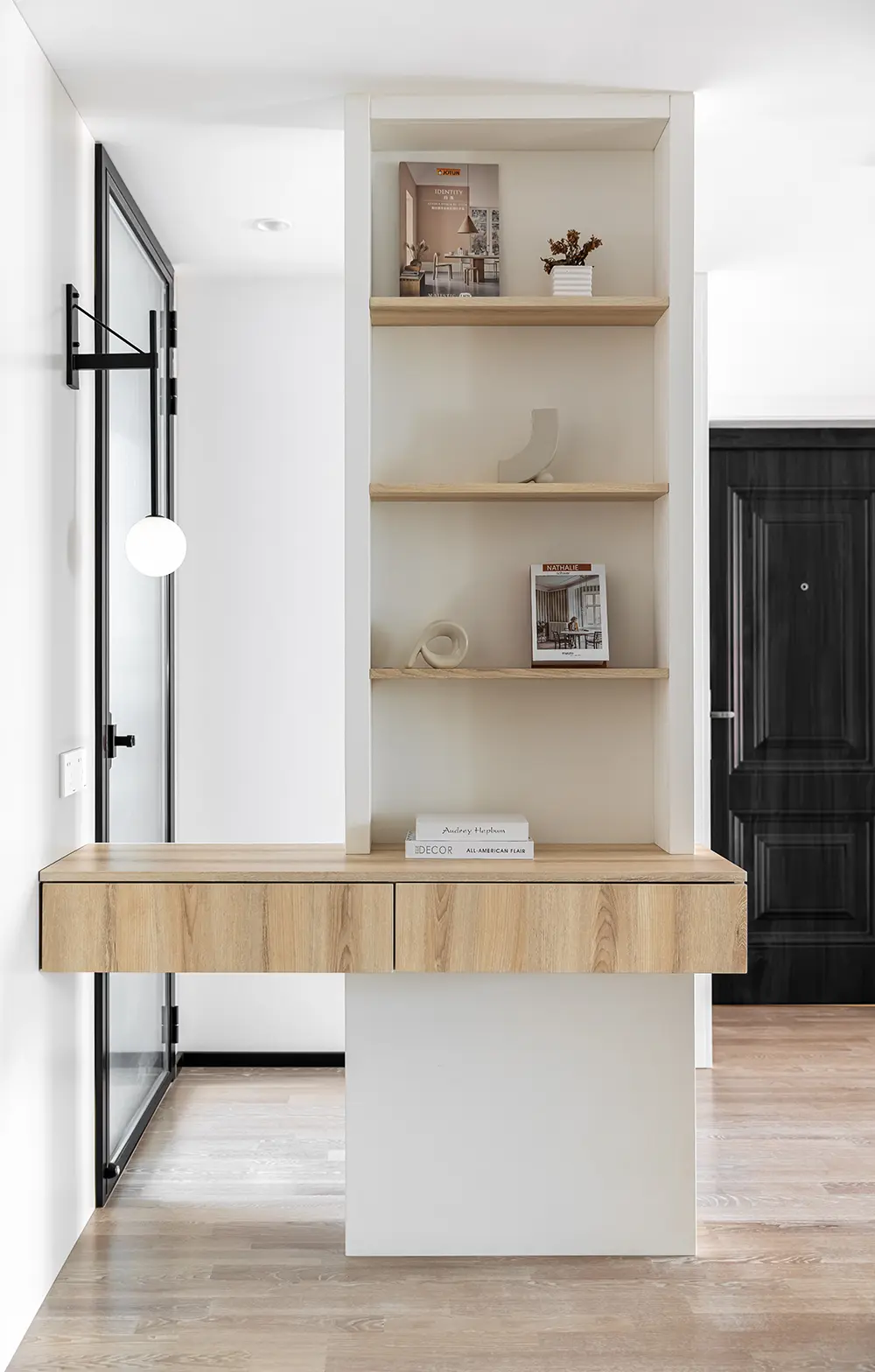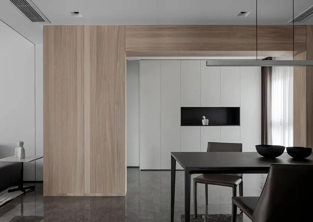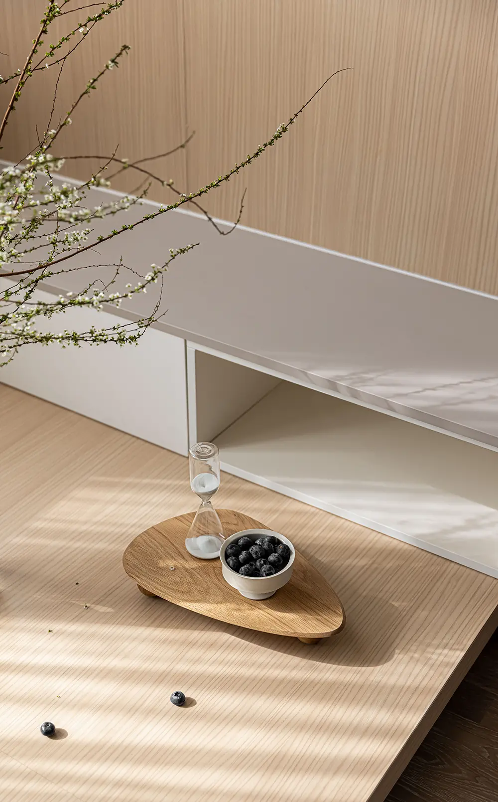 定制半开放餐边柜,作为厨房和餐厅的过渡与连接,白色与原木色搭配,整体呈现自然净透的空间质感。