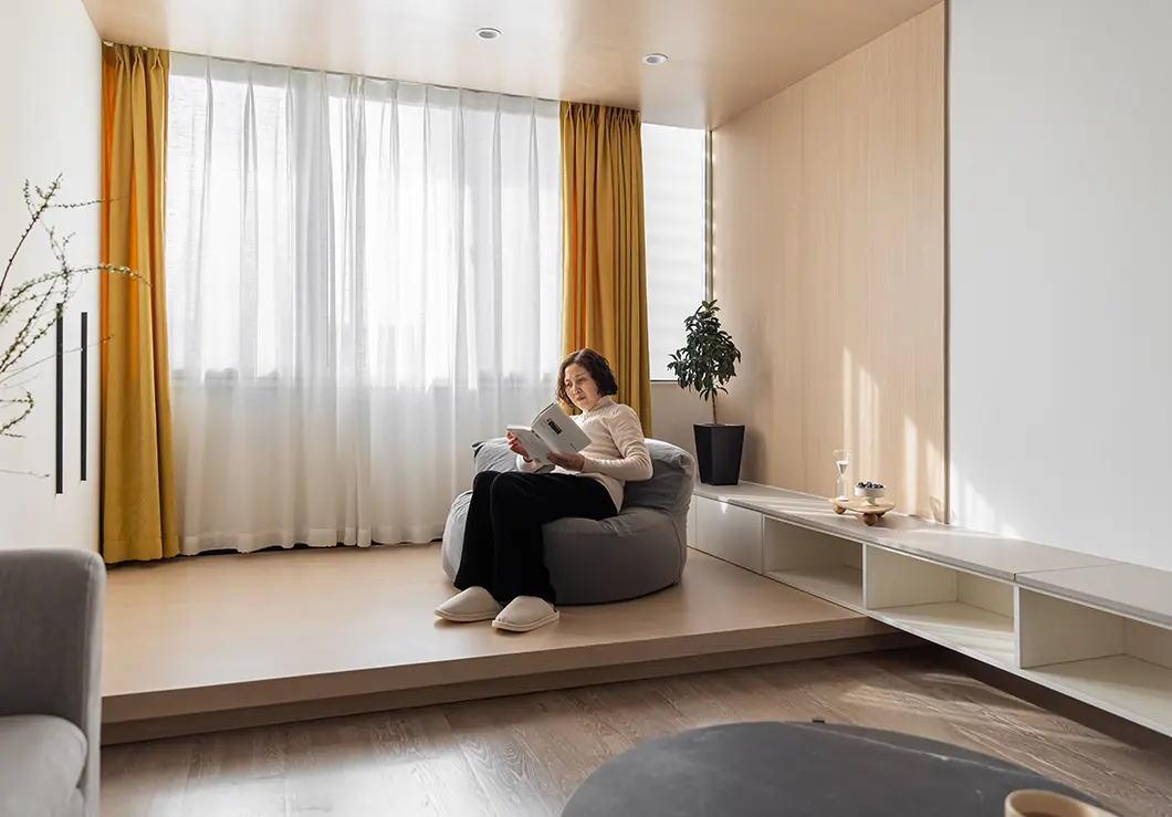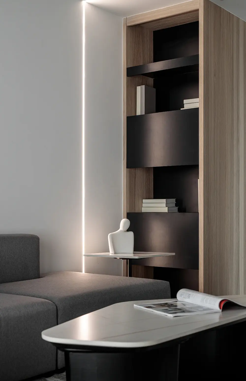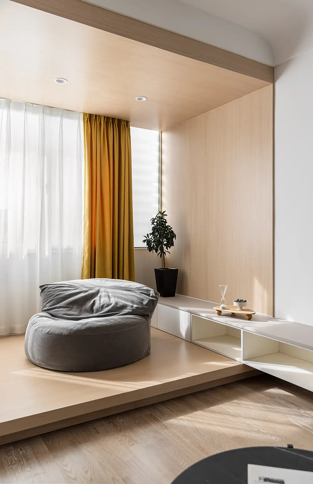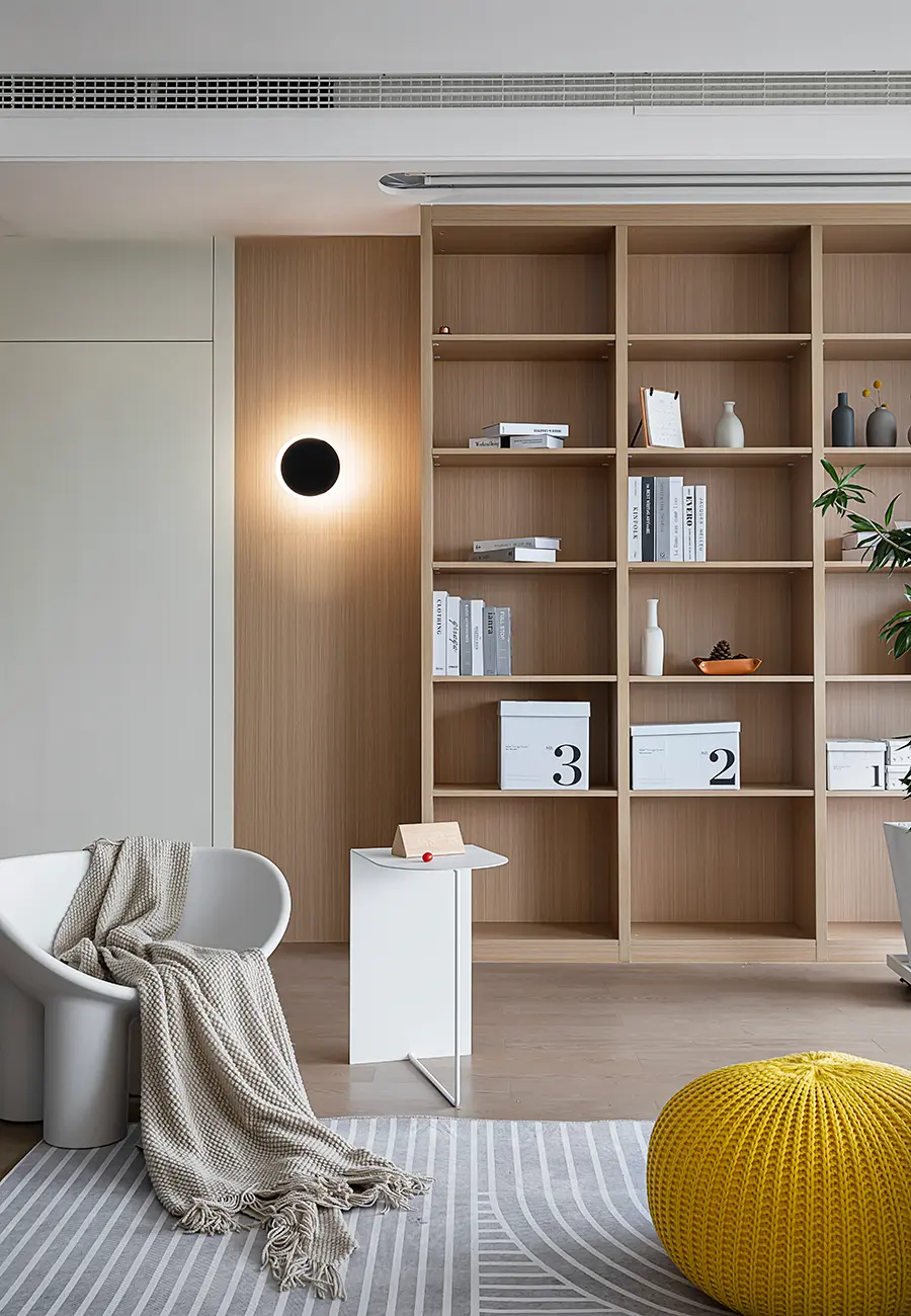 木色的定制家具带给整个空间温暖感,兼备了储物和书柜的功能,同时也犹如墙一般既可以实现空间的相互连贯,又可以构成空间的相互分隔。
