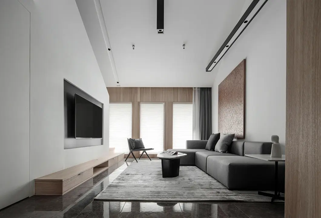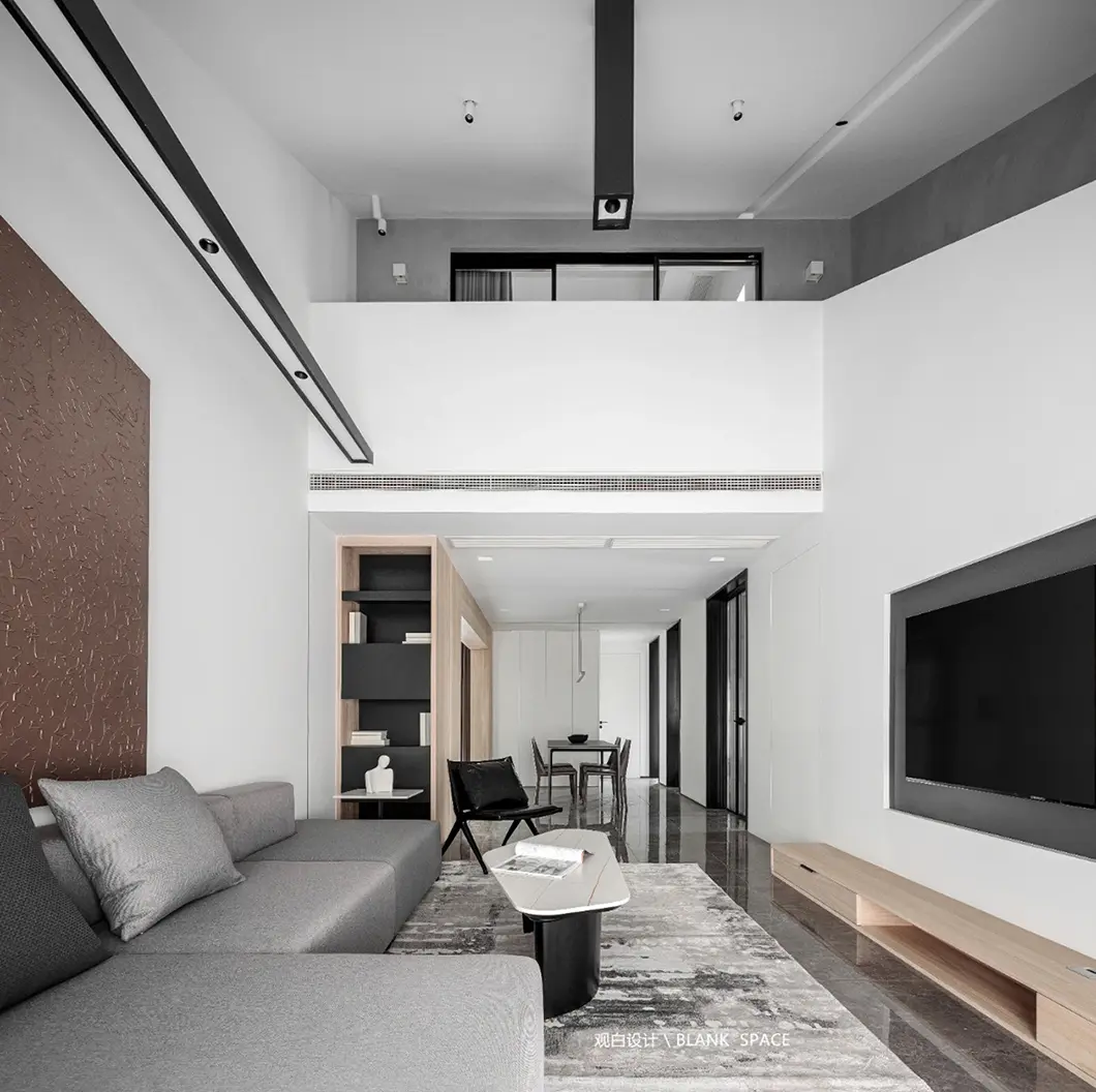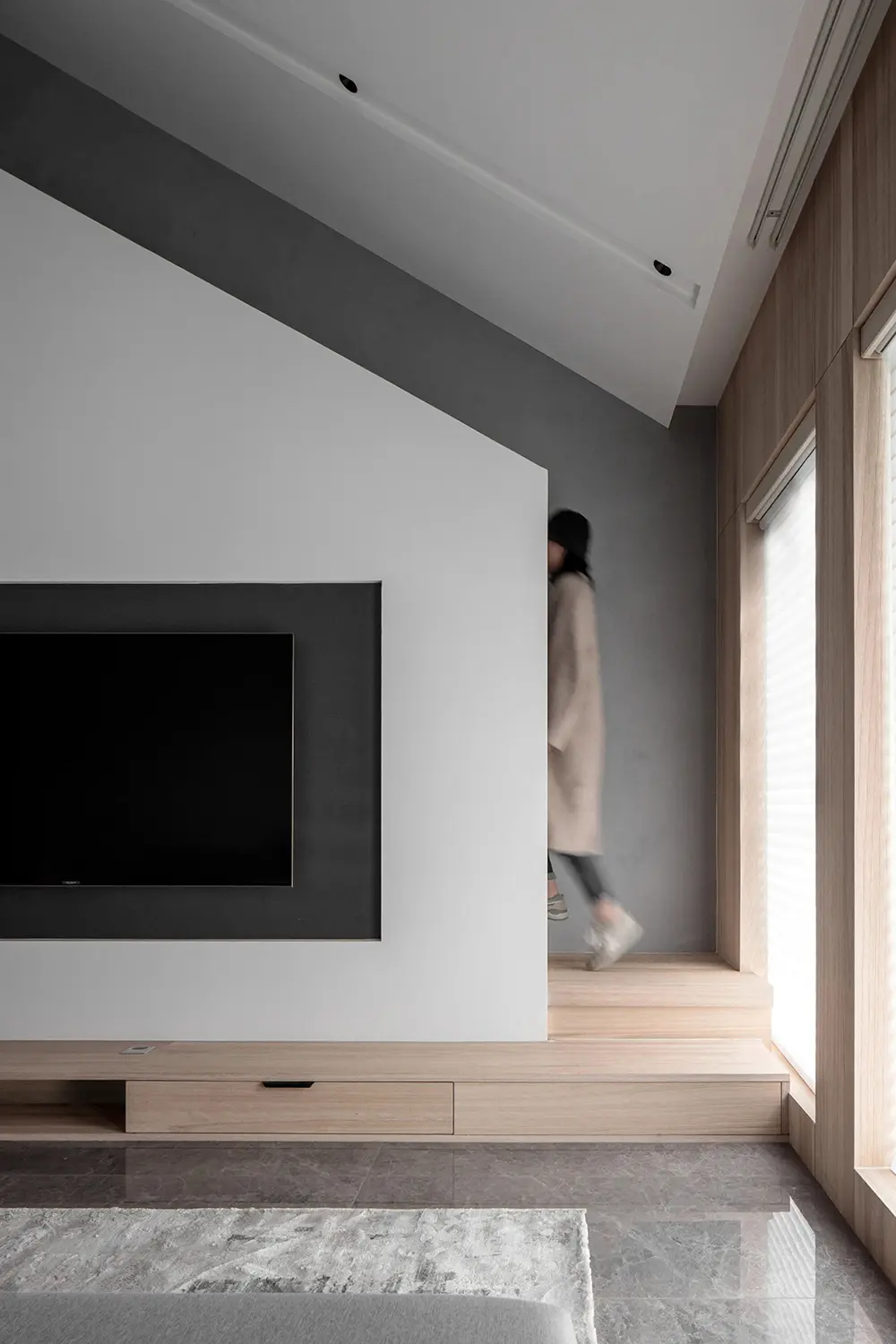 电视柜与楼梯相连,成为一个整体,木制的楼梯富有质感,向上的楼梯与向上的顶面平行,呼吁彼此又衔接了空间。