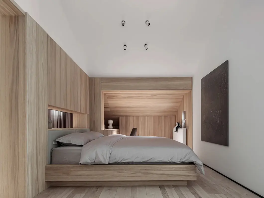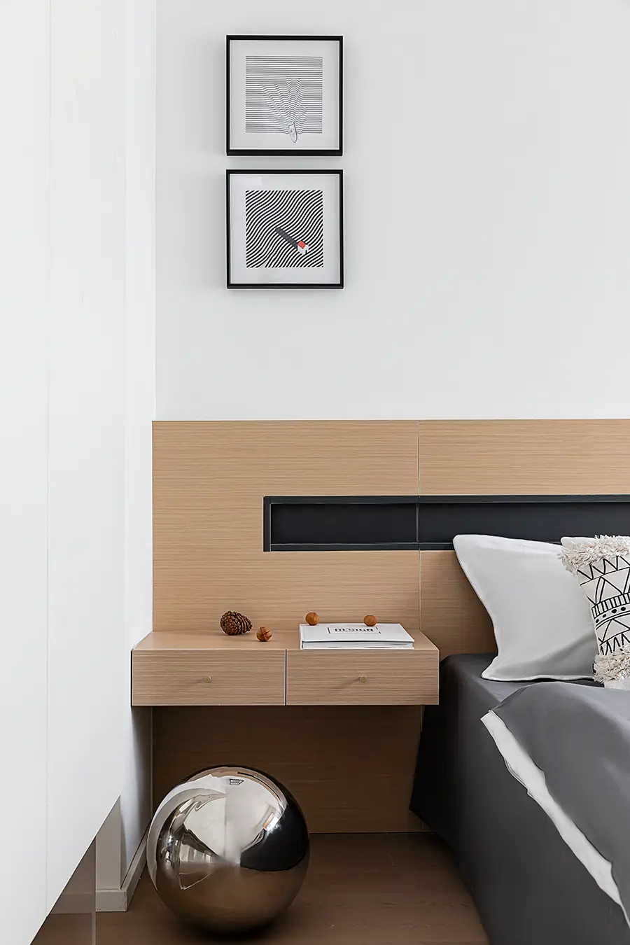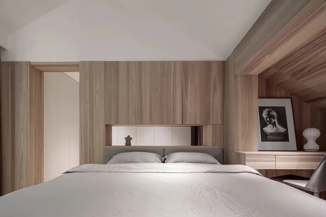 设计师通过家居色彩的变化可以营造出不同个性的卧室环境。现代风格中白色的定制家具和木材元素搭配起来,让卧室多出自然气息,也更有品位。