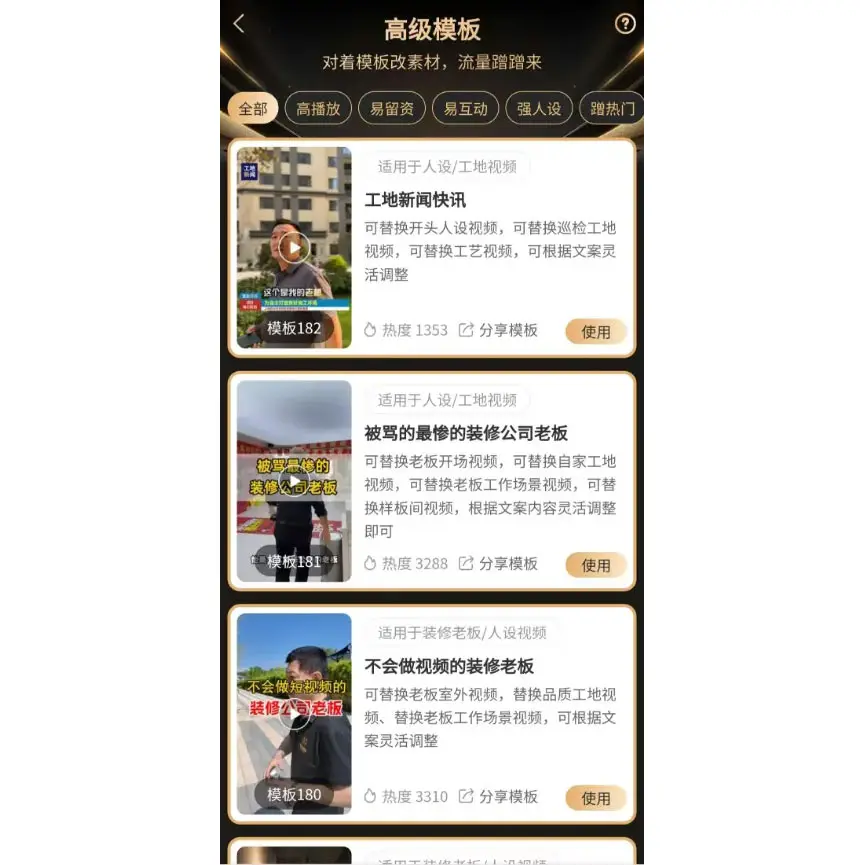新增装修老板人设模板,一键替换视频素材,生成自己的营销短视频,助力在各大短视频平台宣传推广获客