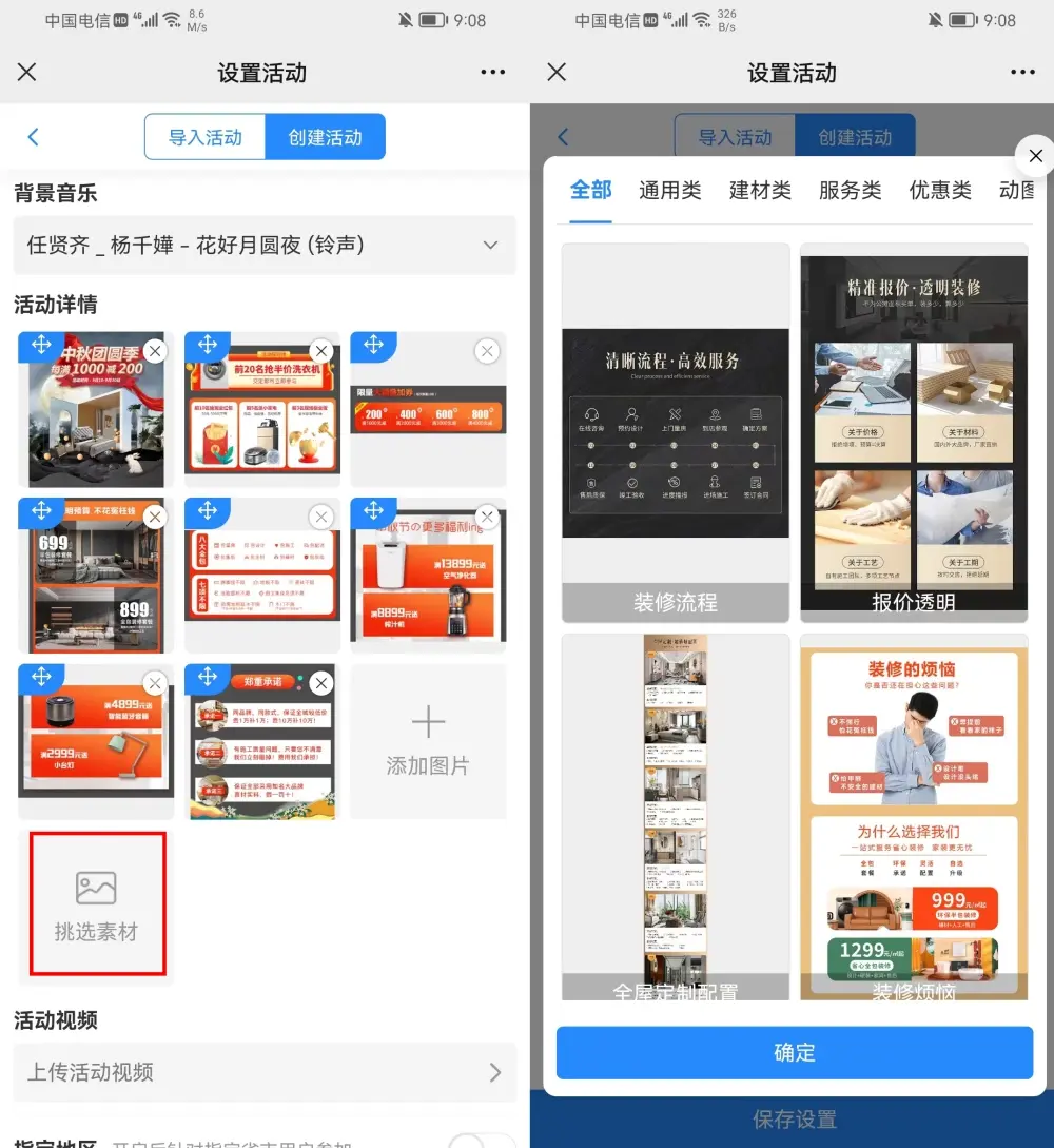 活动,大转盘,文章,商品设置页里新增挑选素材功能,企业端在使用时可以在素材里挑选系统提供的海报图使用。