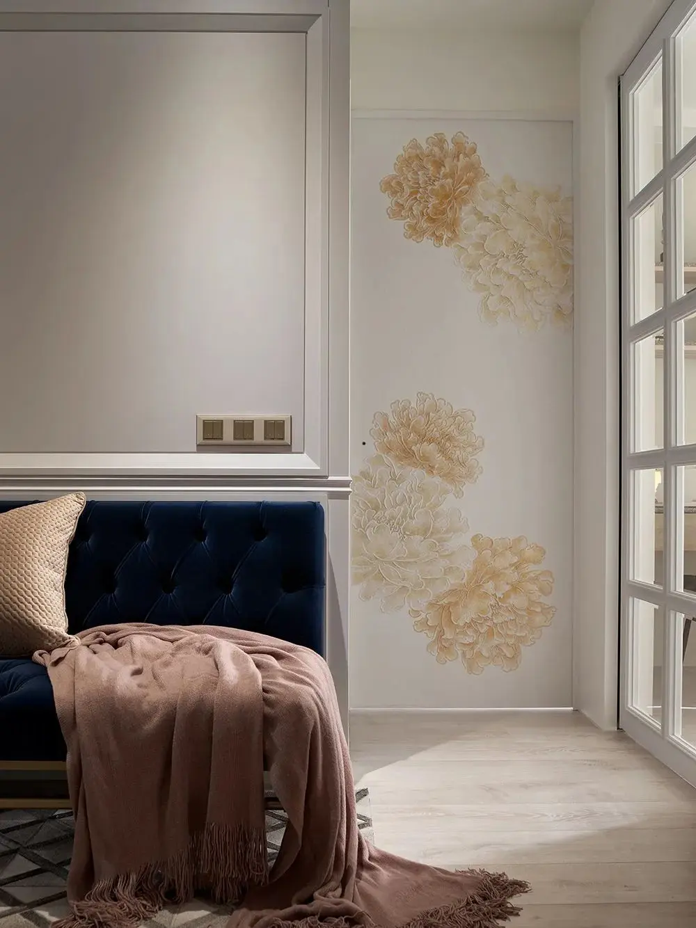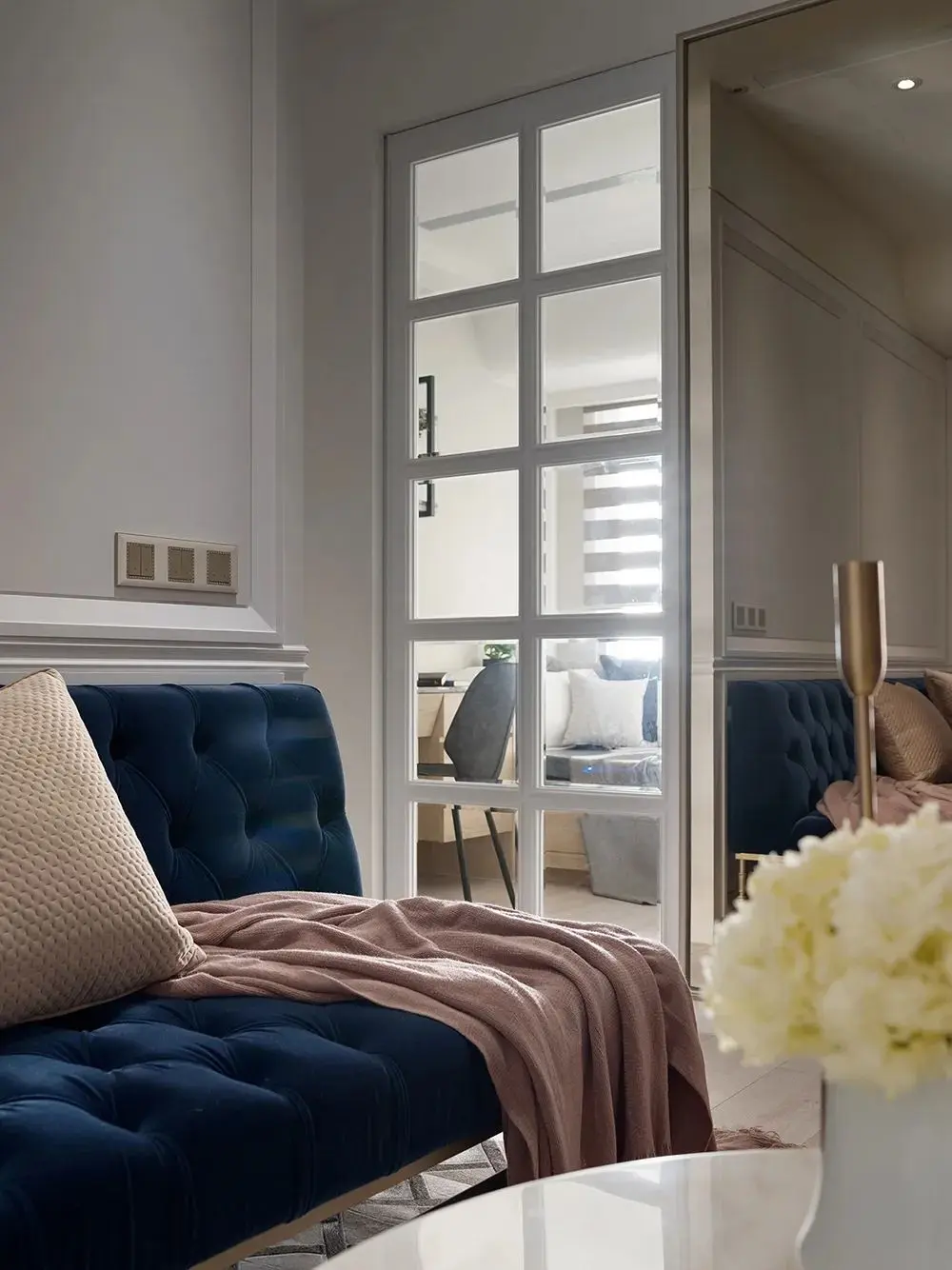 房门上金色的牡丹花纹,也和空间内的黄铜元素有一个呼应。
