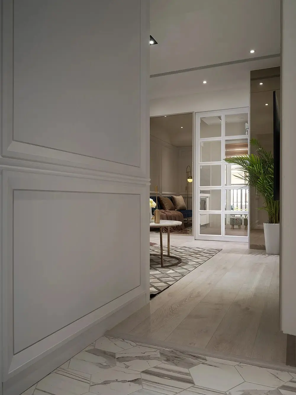 玄关比较抢眼的就是六边形大理石纹样的地砖,狂放自然的纹理互相交错,将玄关完全独立地划分出来。