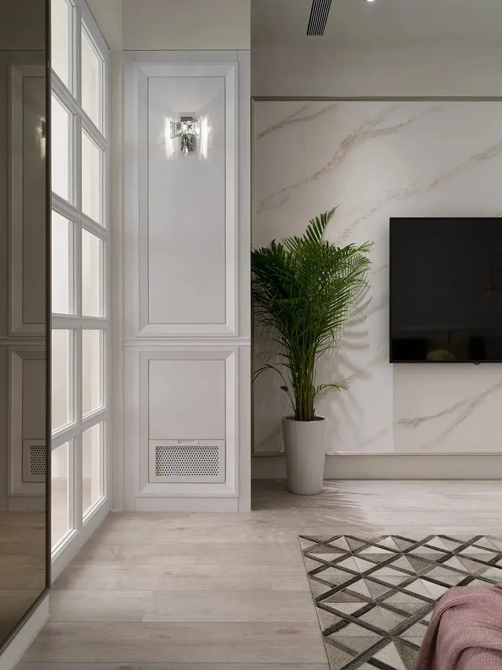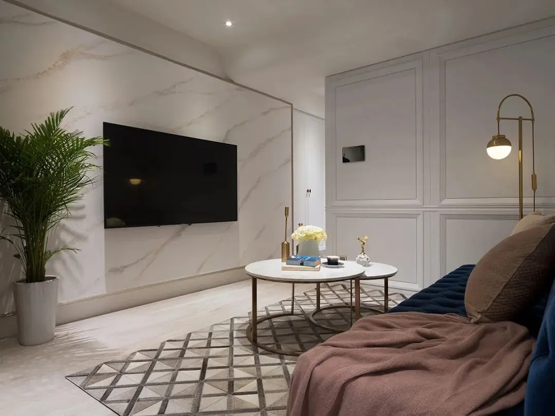 大理石纹样的电视背景墙和玄关的地面有一个呼应,天然的机理看起来也十分精致。