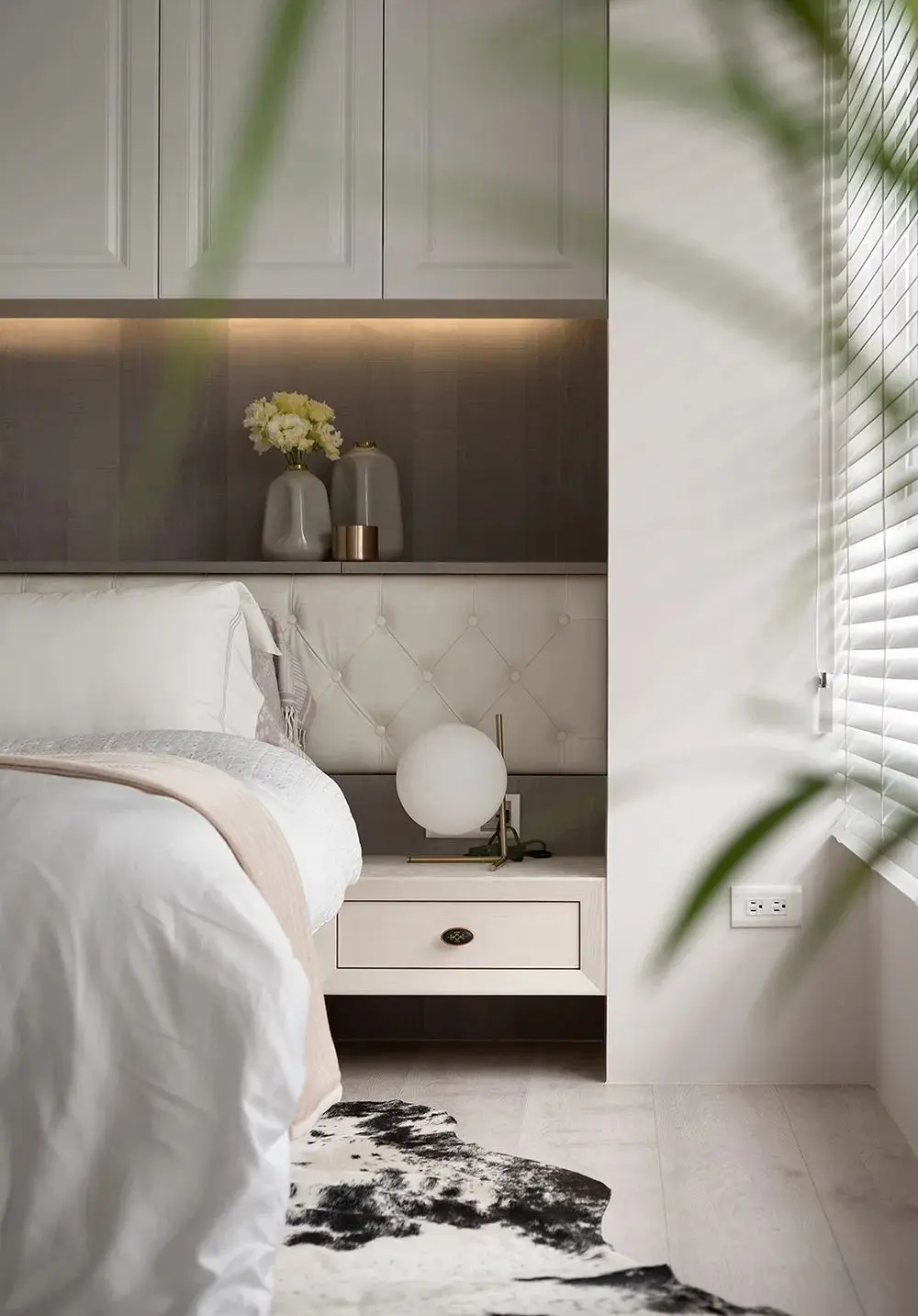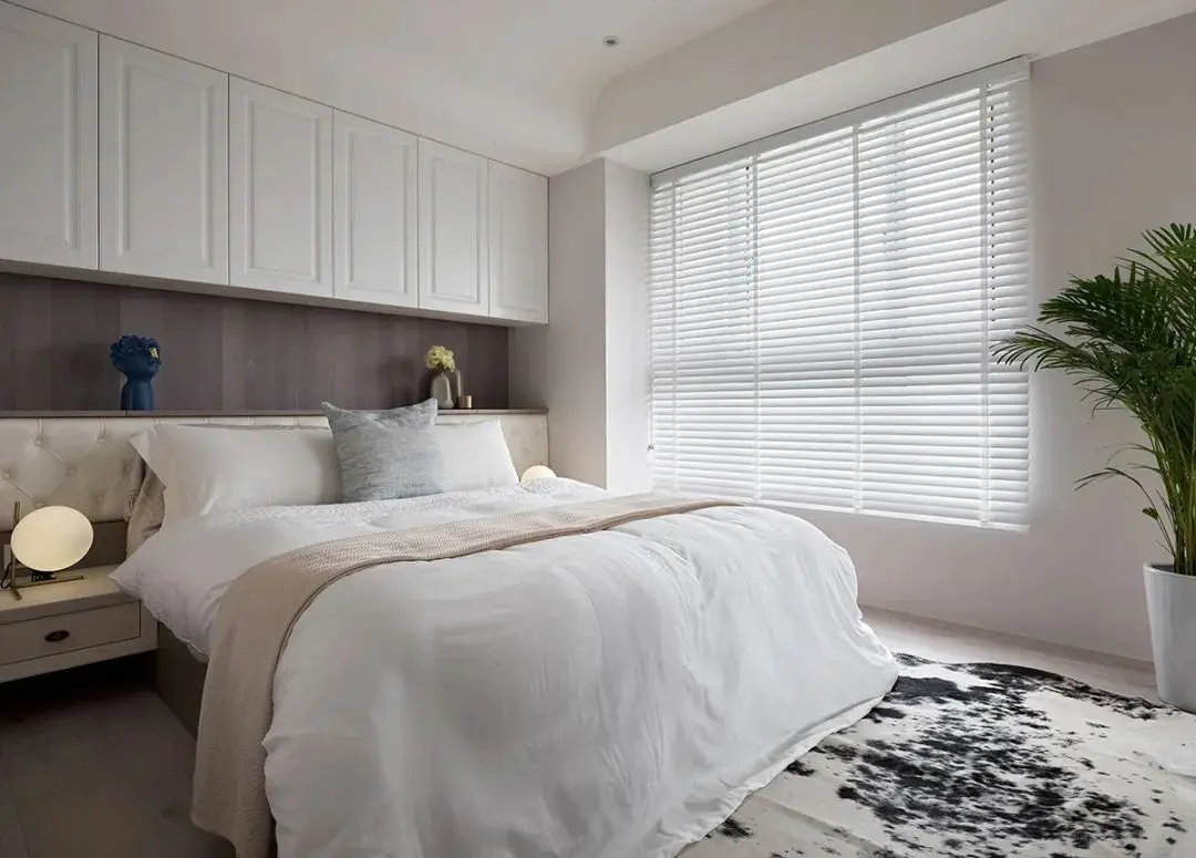 主卧的装修比较特别,为了增加储物空间,在床头做了吊柜的设计。