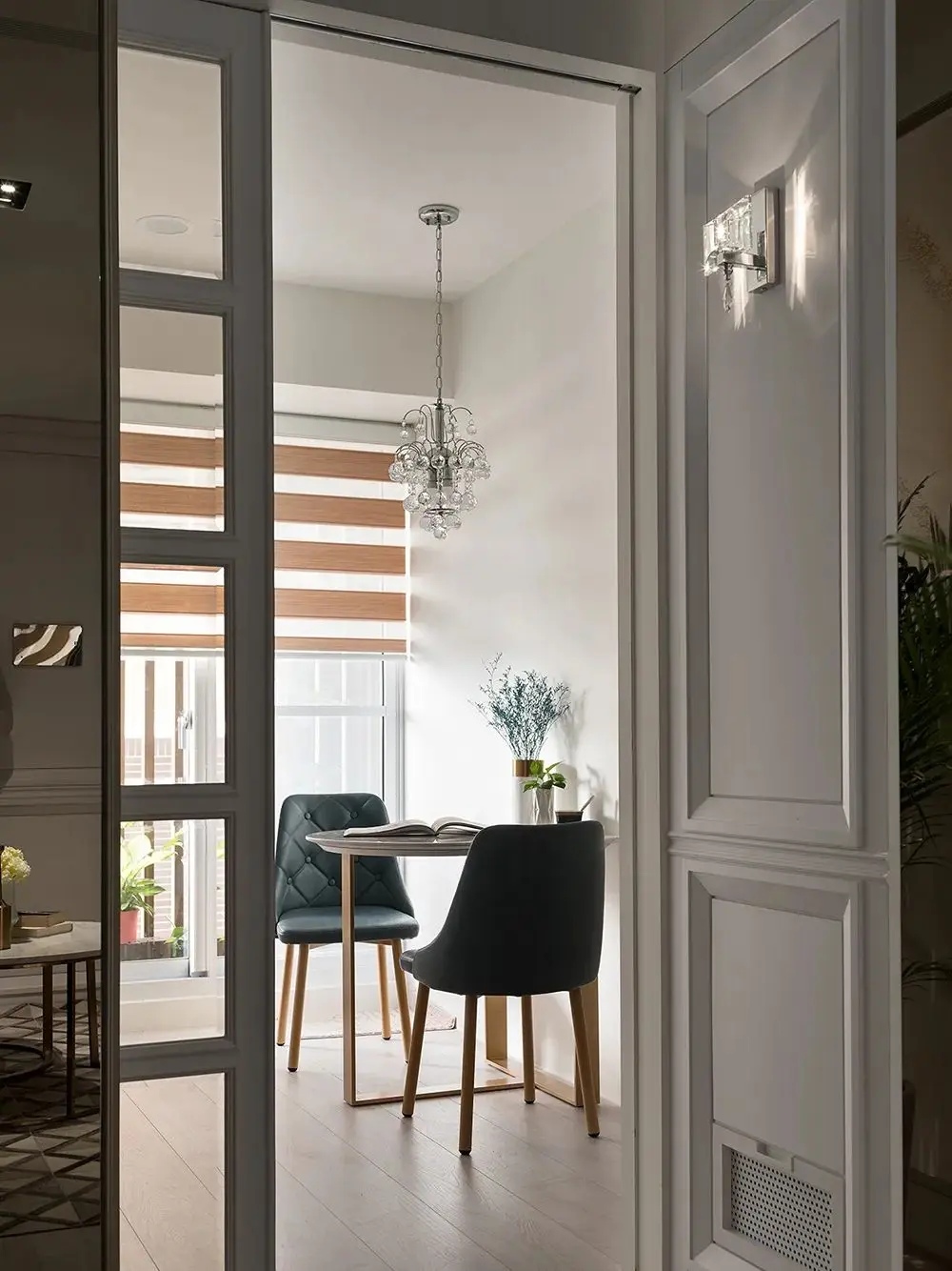 坐在沙发上侧头一望,便是书房区域,采用了玻璃门,能让书房的光洒进客厅。
