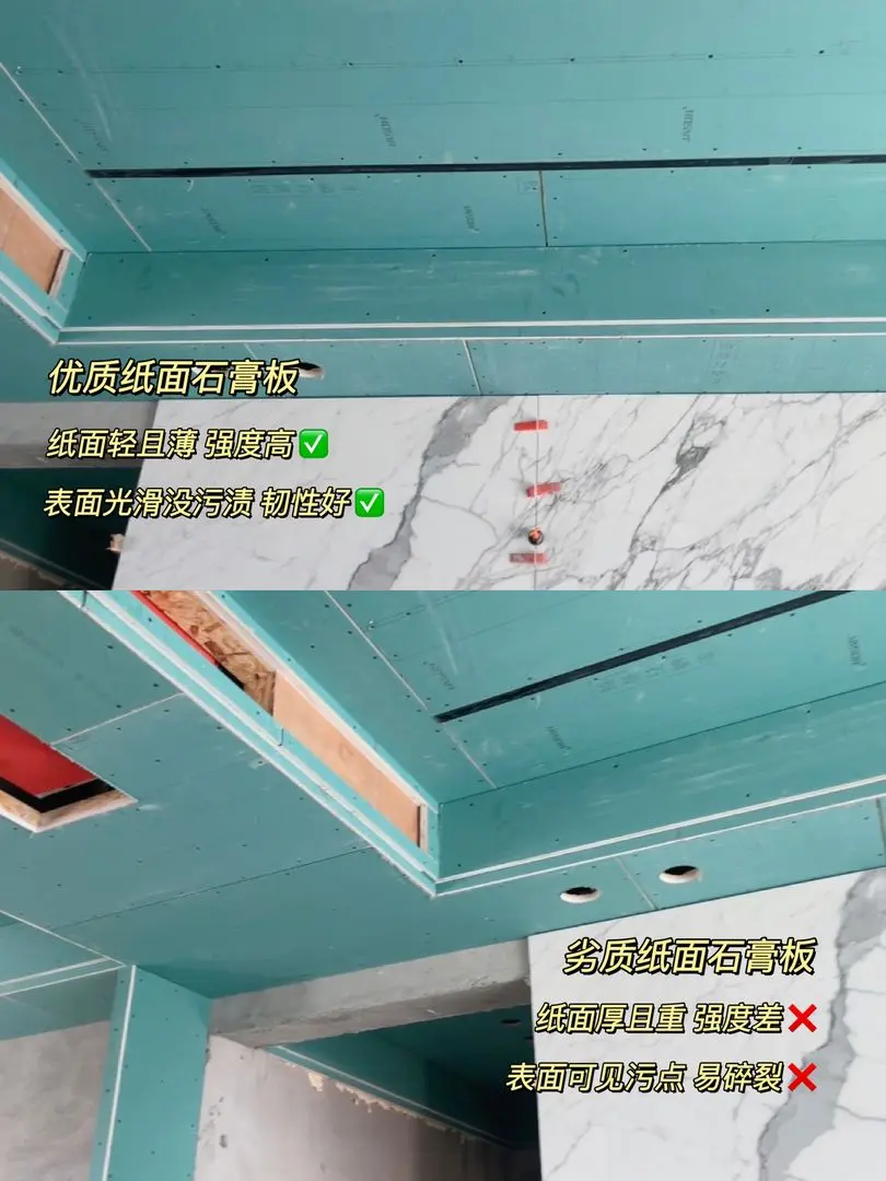 用壁纸刀在石膏板的表面画一个“×〞,在交叉的地方撕开表面,优质的纸层不会脱离石膏芯,而劣质的纸层可以撕下来,使石膏芯暴露出来⁉️