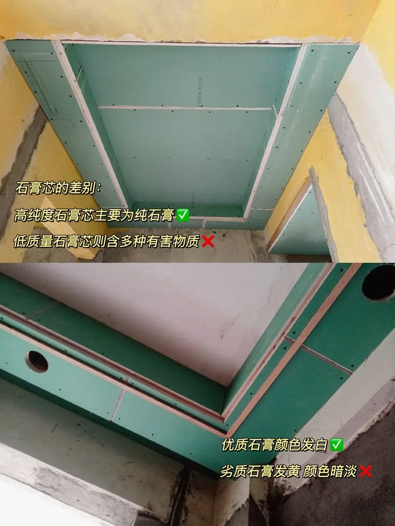 高纯度的石膏芯主料为纯石膏,而低质量石膏芯则含有很多有害物质‼️,从外观看,好的石膏芯颜色发白,而劣质的发黄,颜色暗淡️