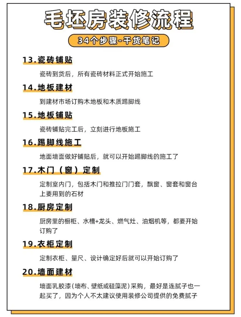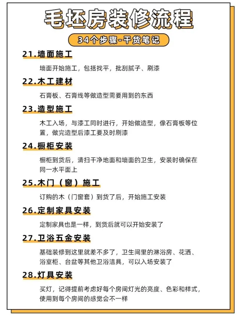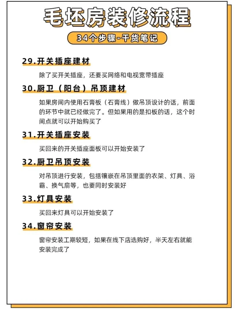 装修小白不要慌,这34个步骤是你未来新家必须要经历的,赶快收藏起来,时刻了解自己的装修进度~还有哪些材料可以网购,哪些绝不可以网购都帮你总结好了,赶快保存下来吧!