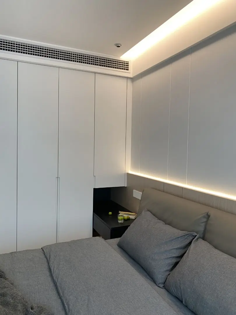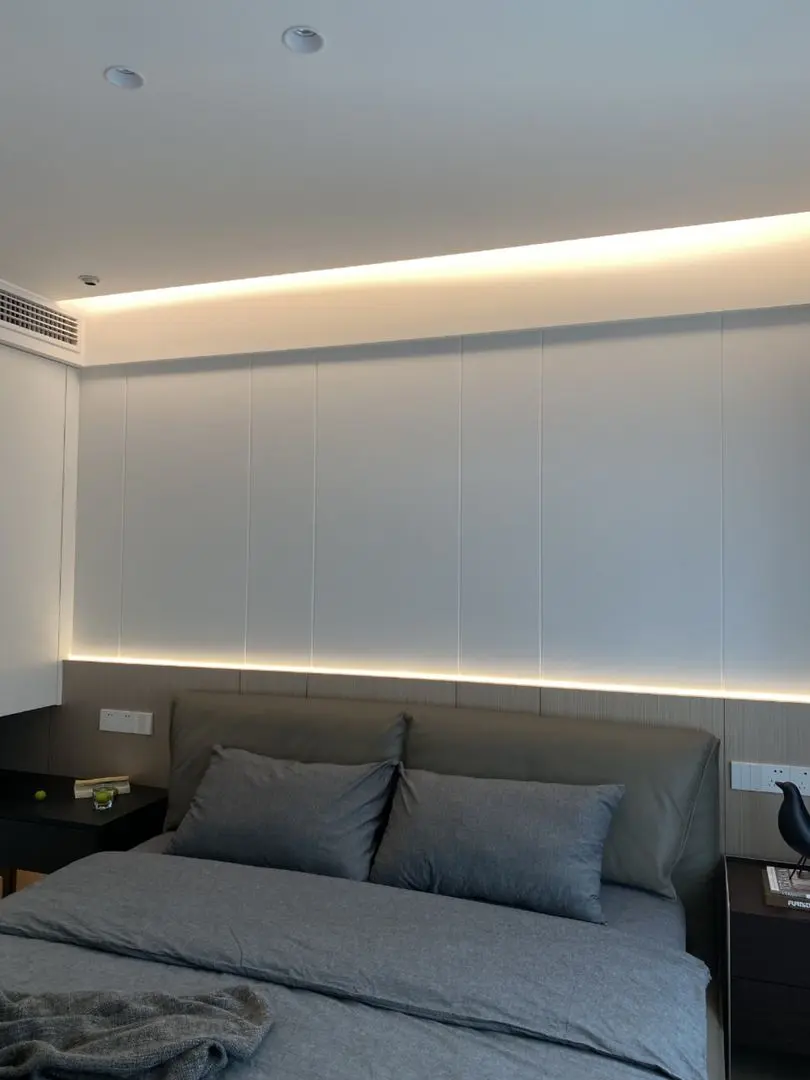 在床头背景墙床头柜下面藏灯带,为宁静的夜晚营造静谧感。