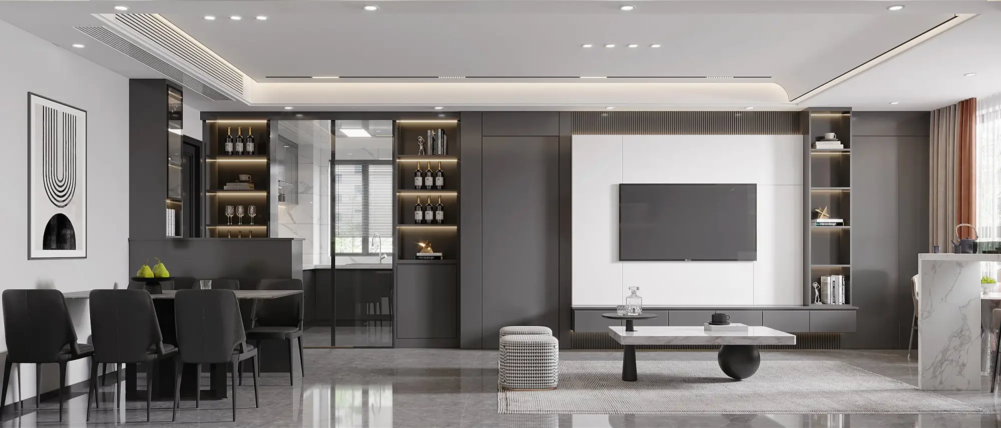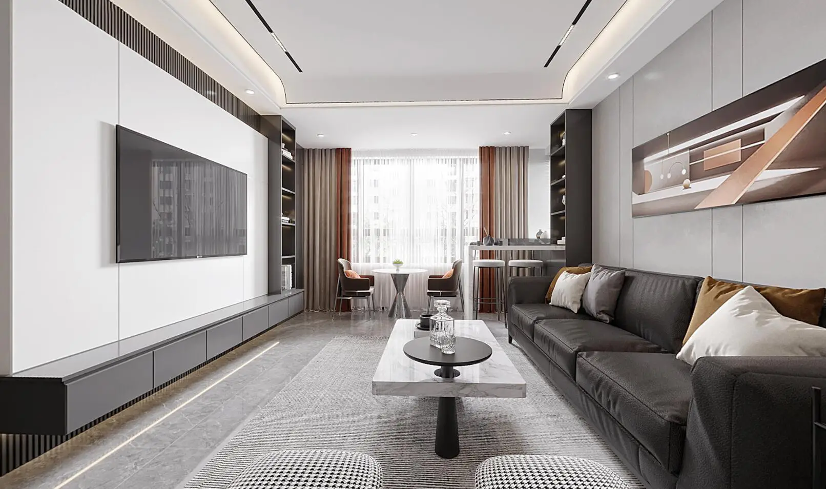 客厅的布置时尚精致,定制的电视背景墙做的饰面板与收纳柜的拼接设计,大面积的窗户,为室内空间带来了充足的采光。一组深色的沙发与石材的茶几相结合,营造出一个大气的空间氛围。